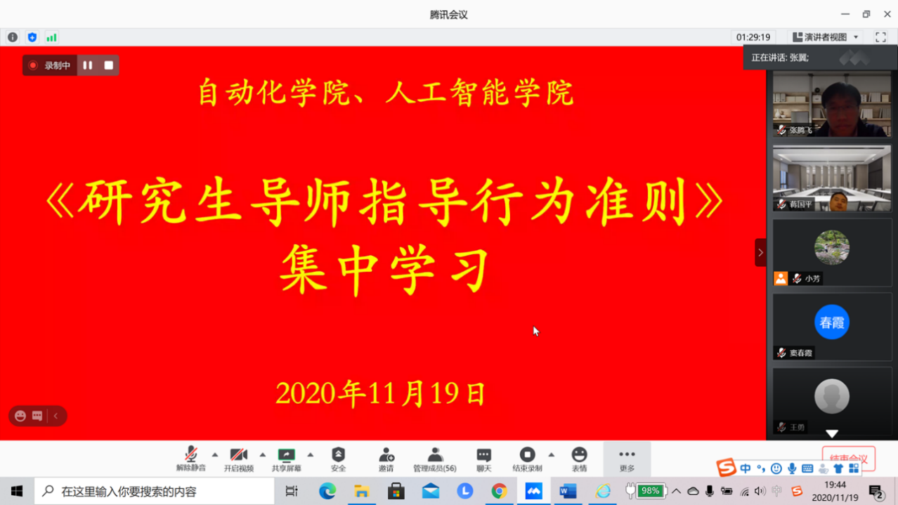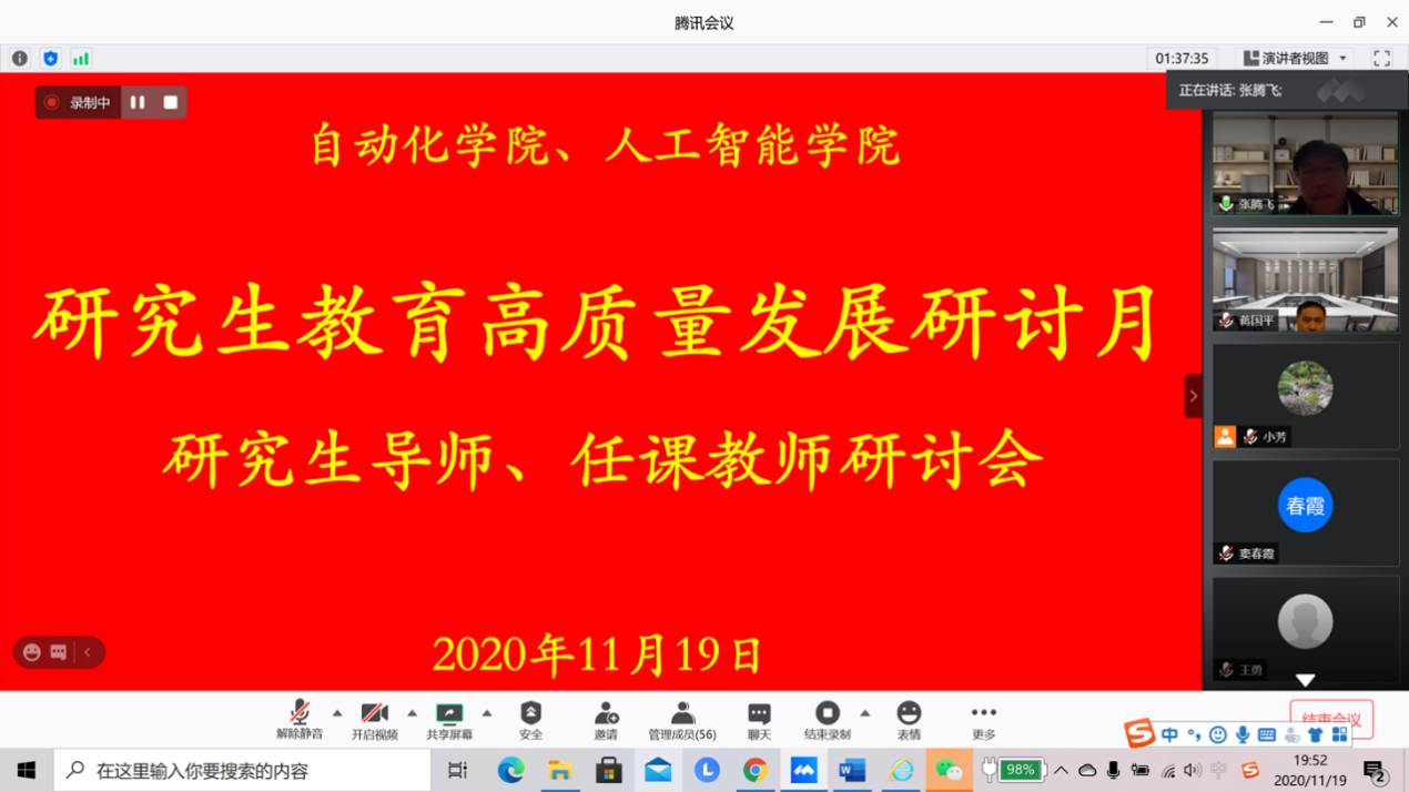 2020年11月19日,开云体育下载 通过腾讯会议组织全体研究生导师集中学习《研究生导师指导行为准则》,并组织召开研究生导师、任课教师研讨会。蒋国平副校长、开云体育下载 张翼书记出席会议,开云体育下载 研究生导师和任课教师参会。