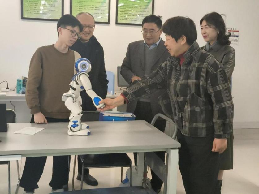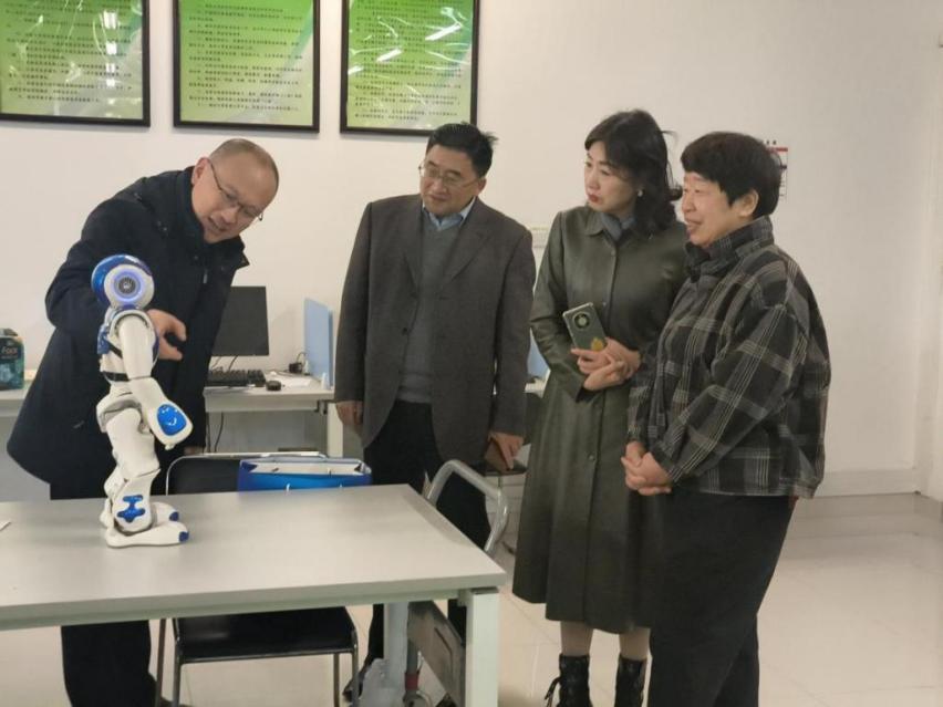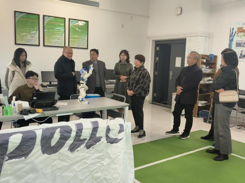调研组观看了智能机器人科技比赛视频,体验了“听机器人讲故事“、“与机器人握手”等。郑春春、梁志伟老师分别代表开云体育下载 介绍了开云体育下载 大学生参与机器人科创比赛的近况及项目成果,展示了南邮学子的创新智慧与创新风采。