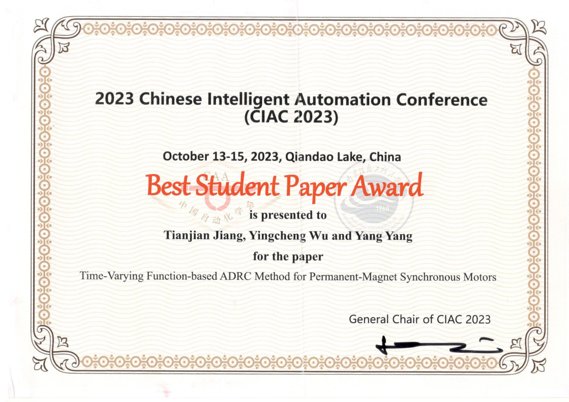 开云体育下载 杨杨教授指导的智能科学与技术专业2020级本科生蒋天健论文《Time-Varying Function-Based ADRC Controller for Permanent-Magnet Synchronous Motors》经大会评审,被评选为会议唯一的最佳学生论文奖(Best Student Paper Award)。