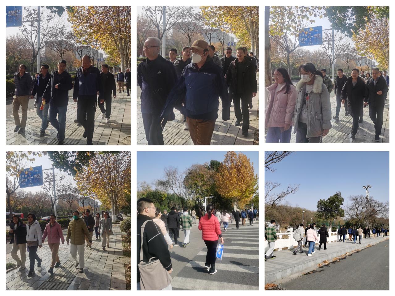 活动当天,参加线下健身走的教职工在仙林校区南门圆楼处集合,拍照留念,随后步行至羊山湖公园完成环湖健身走。为提高活动的参与度,采用线下和线上结合的方式进行,部分无法现场参加的教职工,自行选择时间和路线完成线上健步走。