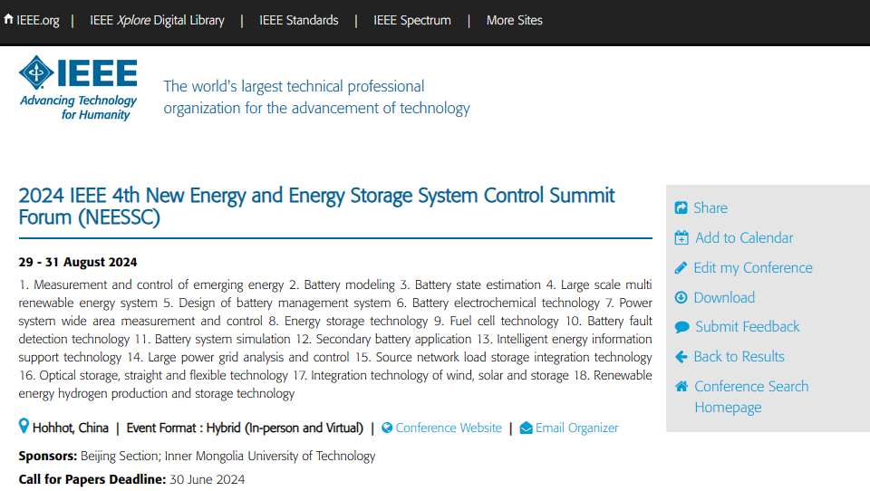 第四届新能源与储能系统会议暨第一届IEEE PES智能电网与新技术委员会(中国)年会将于2024年8月29日至31日在中国内蒙古呼和浩特召开,由内蒙古工业大学、西南科技大学、IEEE北京分会 、IEEE PES智能电网与新技术委员会(中国)、中国科学技术大学、四川大学、电子科技大学、西南交通大学、成都信息工程大学、国家工信部创新成果产业化公共服务平台、中国仿真学会仿真技术应用专业委员会、中国自动化学会新能源与储能系统控制专委会联合主办,由内蒙古工业大学电力开云体育下载 、智慧储能研究院、大规模储能技术教育部工程研究中心、内蒙古能源战略研究中心联合承办。
