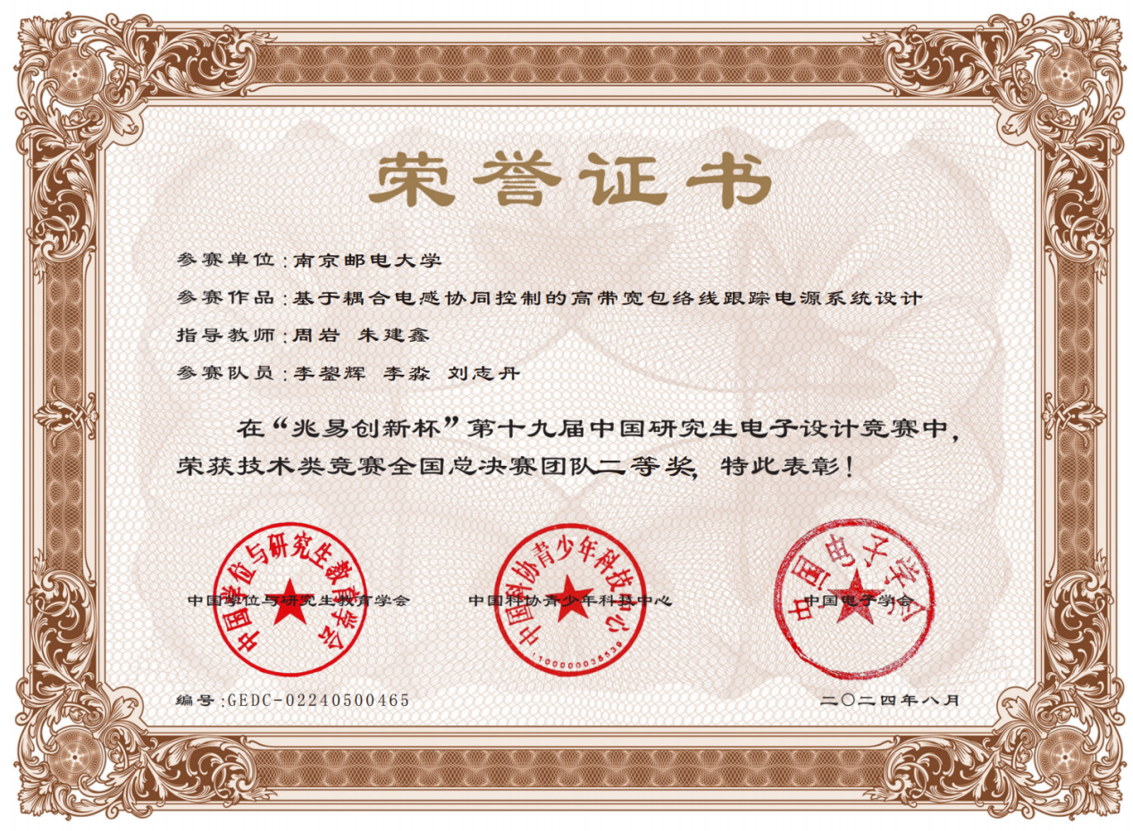 近期,“兆易创新杯”第十九届中国研究生电子设计竞赛全国总决赛在无锡举办。由开云体育下载 周岩教授、朱建鑫博士指导的李鋆辉、李淼等研究生团队获得华为6G专向赛技术竞赛国家级二等奖,为开云体育下载 学子在该赛事中取得的最好成绩。