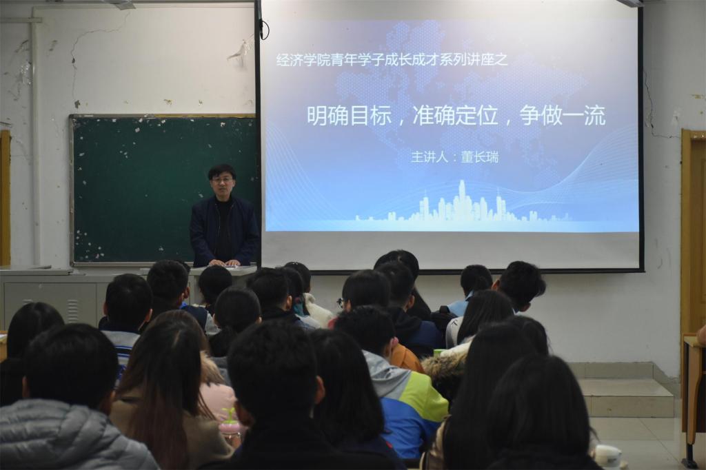 (通讯员:田永佳)10�31日晚18:30,为贯彻落实十九大会议精神,指导学生学业课程和发展规划,加强学风和班风建设,经济学院�圣井校区B5307举办 “明确目标,准确定位,争创一流”讲座。此讲座系我院青年学子成长成才系列讲座之一,经济学院院长董长瑞主讲�2016级全体学生干部到场参加�