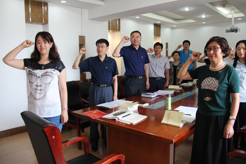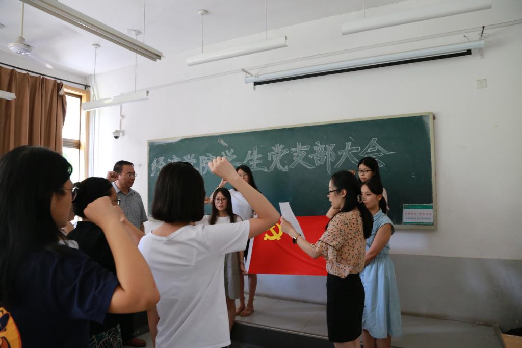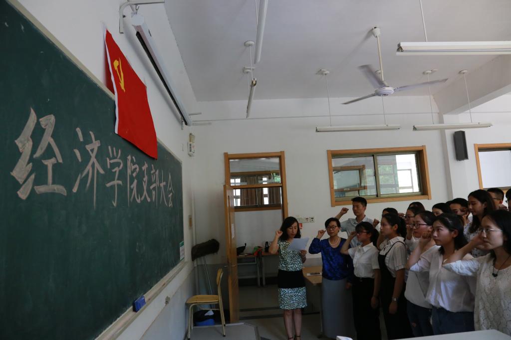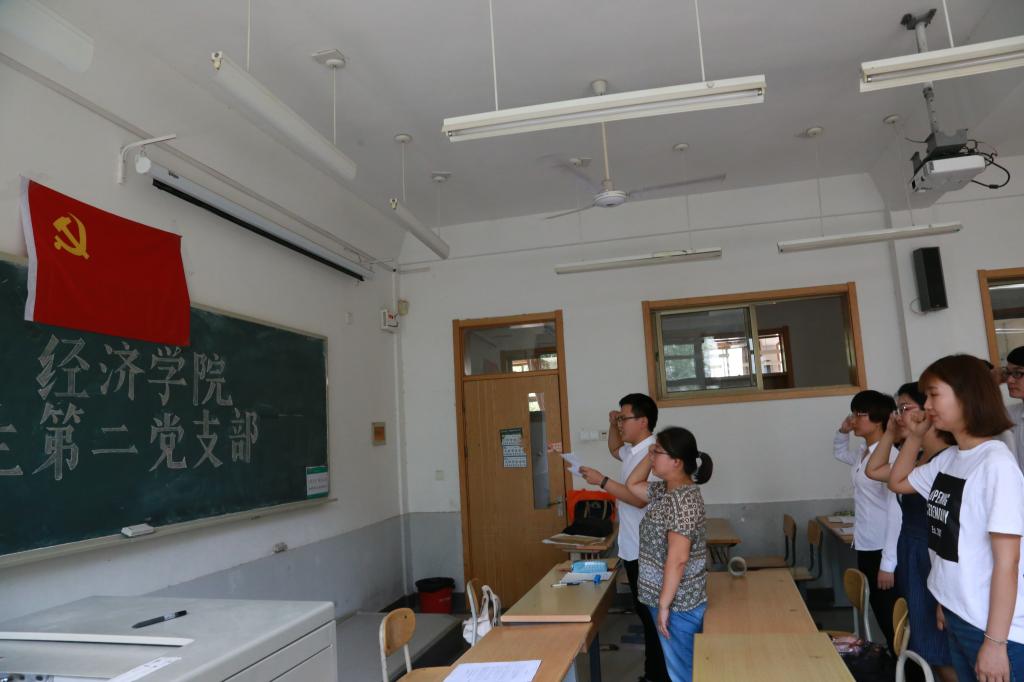 经济学院各学生党支部、教职工党支�2017�6�27日及6�29日相继于舜耕校区举行了预备党员入党宣誓和老党员重温入党誓词仪式。全体正式党员、预备党员参加了仪式。全体党员佩戴党徽,面对鲜红的党旗,高举右手庄重宣誓:“我志愿加入中国共产党,拥护党的纲领,遵守党的章程……永不叛党。”铮铮誓言,表明了一个共产党员积极接受党性熏陶,矢志不渝地坚持�的理想信念的人生选择�