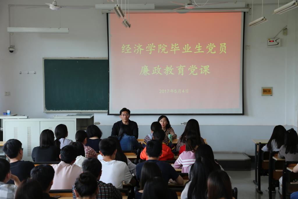 (通讯员:付雯 姜贵祥)为进一步贯彻落实学校党风廉政建设会议精神,增强毕业生党员廉洁自律意识,5�4日下�3:00,经济学院于舜耕校�1404教室举办毕业生党员廉政教育党课。党课由经济学院党委副书记任海伦主讲�2017届全体毕业生党员参加。院团委正科级辅导员付雯主持�