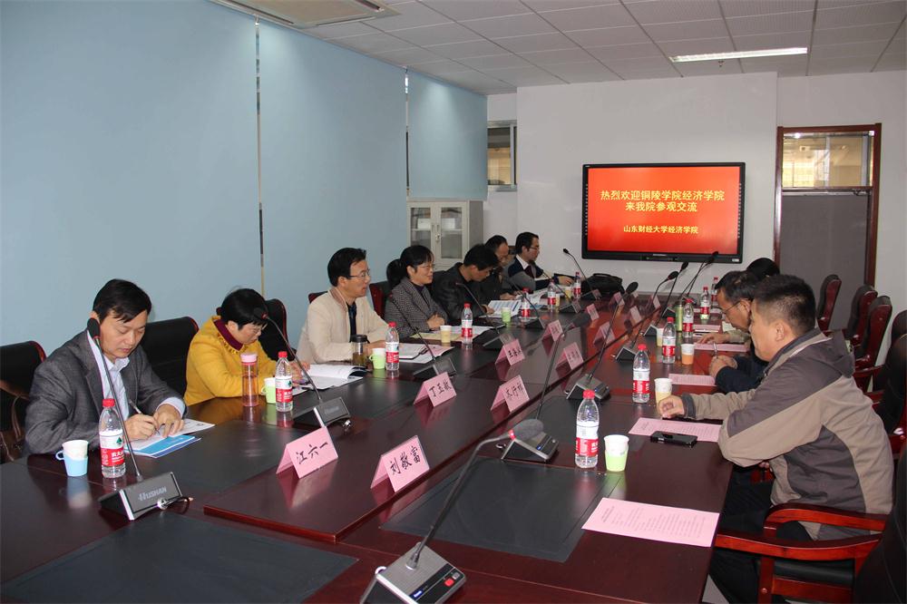 谭院长一行在陈保启副院长的陪同下参观了教学实验中心�在两院交流座谈会上,董长瑞院长代表学院对谭�长一行的到来表示热烈欢迎,并简要介绍了院的基本情况和办学特点�谭艳华院�对我院领导�热情接待表示衷心感谢,�介绍了铜陵学院师资量和学科专业建设情况,谭院长表示:�山东财经大学经济学院在办学理�、才培养和实验室建设等方面成果显著,值得学习借鉴,同时,希望今后能够进一步加强双方之间的交流合作,共同推进�育事业的发展。”随后,双方在研究生招生、人才引进等方面进行了深入交流�