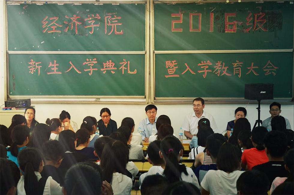 (通讯员:李雨桐、姜立阳�8�29日下�14:30,经济学�2016级新生开学典礼暨入学教育大会于圣井校区敏行楼B5-201教室隆重举行。经济学院院长董长瑞、党委书记吴红文、副院长王传荣、副书记任海伦、仵颖涛,教师代表于凤芹、院团委辅导员出席会议�2016级全体新生�场参加,会议由任海伦主持�