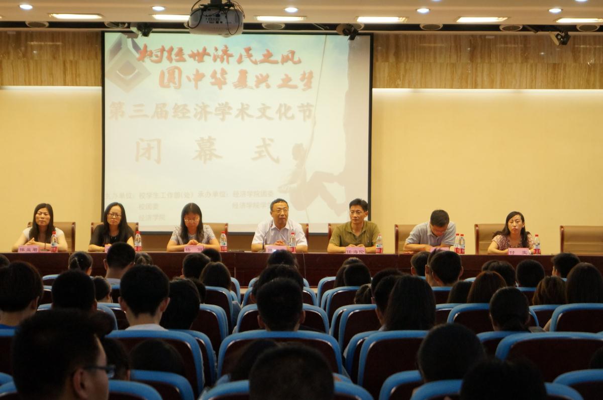 6�18日下�15:00�由校学生工作部(处)、校团委和经济学院共同主办,经济学院团委和学生会承办的“树经世济民之风,圆中华复兴之梦”第三届经济学术文化节闭幕式于圣井校区敏行楼B5-101多功能报告厅举行。出席会议的领导老师有经济学院副院长陈保启教授、党委副书记任海伦、对外交流合作部杨丽教授、产业经济学教研室安丰东副教授,就业办主任兼党委秘书李冰封老师、院团委辅导员付雯、陈盈君老师。获奖学生代表及经济学院13�14级学生参加闭幕式。闭幕式由院党委副书记任海伦主持�