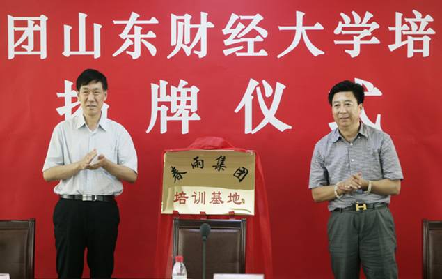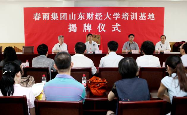 揭牌仪式上,牟思伦在致辞中指出,今�5�8日,“山东财经大学春雨集团大学生实践基地”和“村域经济研究所”相继揭牌成立,今天我们又迎来“春雨集团山东财经大学培训基地”的揭牌,这是促进校企合作、校地合作又一次成功的典范,在学校和春雨集团之间建立了友好合作的桥梁和纽带,提供了更广阔的平台,是一件富民、强村、兴企、利校的好事、实事�