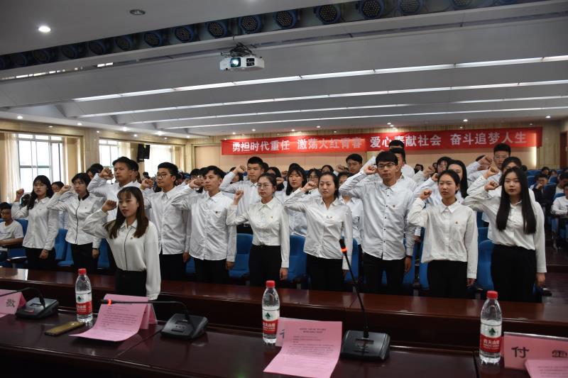 经济学院“关爱小屋”青年志愿者临时团支部全体团员起立,�向团旗重温入团誓词�