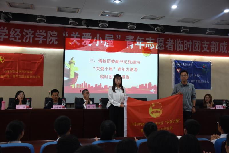 �琦宣布经济学院“关爱小屋”青年志愿者临时团支部的组织构�,谷学峰宣读校团委《关于同意成立经济学院“关爱小屋”青年志愿者临时团支部的批复》,张超为“关爱小屋”青年志愿者临时团支部授旗,临时团支部团员代表李昕同学发言�