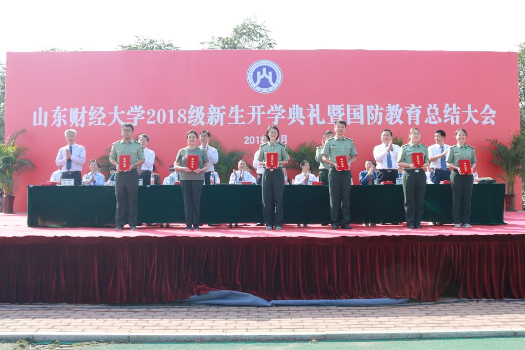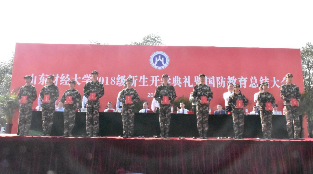校党委书记王邵军宣布山东财经大学2018级新生开学典礼暨国防教育总结大会开始。唱国歌、升国旗仪式后,军训团进行了分列式及表演课目演练。我�2018级新生分成五个连队依次走过主席台。整齐的步伐是昔日汗水凝结的成,嘹亮的口号是百炼成钢的自信与坚定。他们英姿勃发,激情澎湃,传承着财大人拼搏向上的信念,彰显着经济学子永不言弃的精神,以博闻强识、厚学睿思、笃行致远的态度谱写未来人生的新篇章�