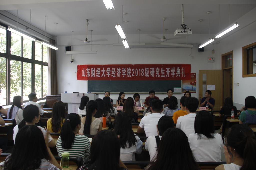 9�6日下�16:30,经济学�2018级研究生开学典礼于舜耕校区教学楼1108教室隆重举行。院长董长瑞,党委书记姜伟,副院长王传荣、彭留英、齐杨,学工办主任周新秀,研究生秘书刘应涛和教师代表崔宝敏出席会议�2018级全体研究生到场�会,会议由彭留英主持�