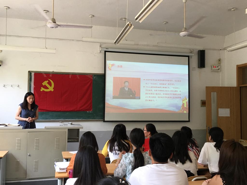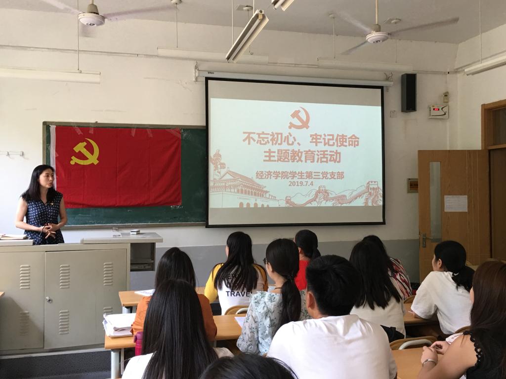 (通员:付雯�7�4日,经济学院副院长彭留英在舜耕校�1号教学为学生第三党支部上“不忘初心,牢记使命”主题教育党课�