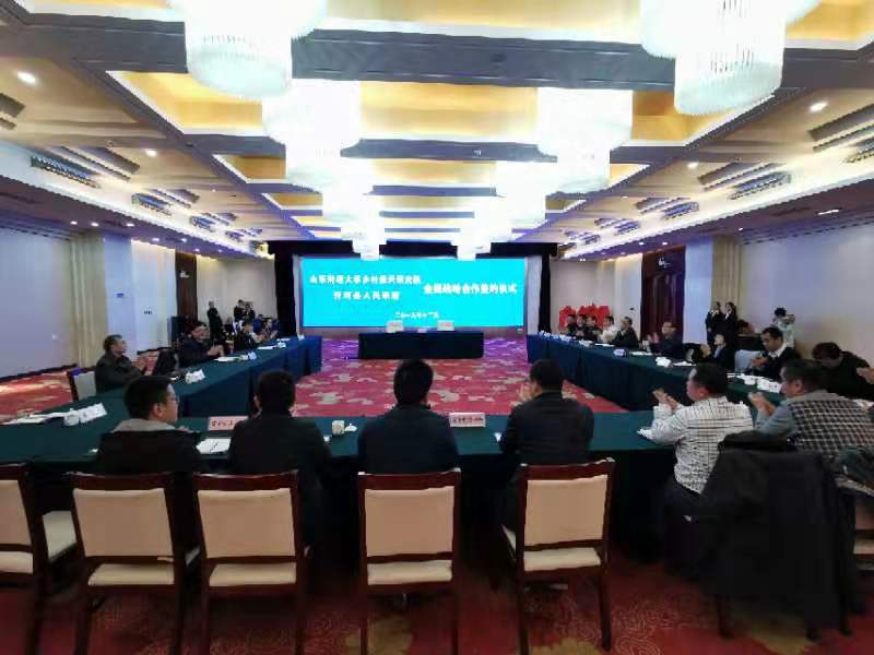 (通讯员:朱海林)2019�12�30日上午,山东财经大学经济学院与齐河县人民政府签署全面战略合作协议仪式在齐河县人民政府举行,齐河县副县长王炜、农业农村局局长王法明、派齐河县乡村振兴服务队队长,生态环保厅土壤环境处二级调研员韩京安、省派齐河县乡村振兴服务队副队长,山东财经大学财税学院党委副书记张代宝、山东财经大学经济学院院长兼乡村振兴研究院院长董长瑞、党委书记姜伟、副书记高峰、乡村振兴研究院执行院长崔宝敏、辅导员朱海林、齐河县相关部门、省派齐河县服务队队员、社会实践基地签约单位主要负责人等出席,签约仪式由齐河县政府办公室副主任韩希国主持�