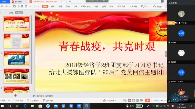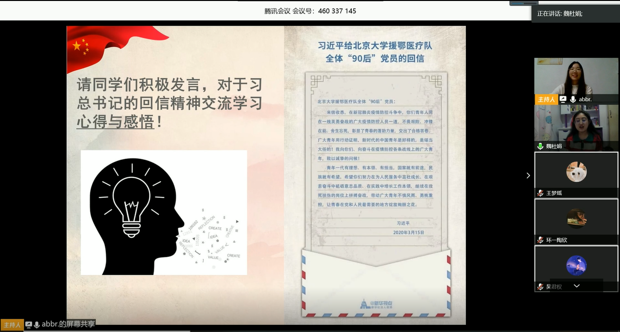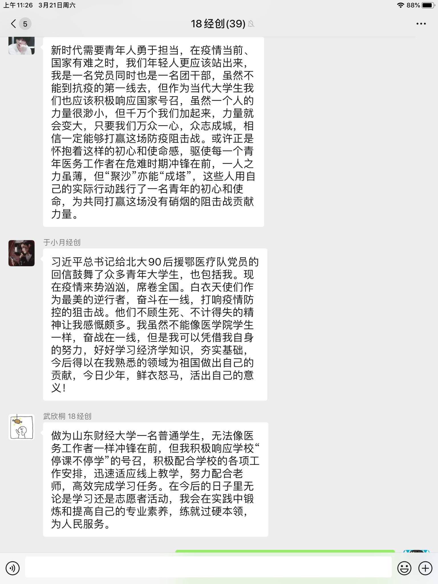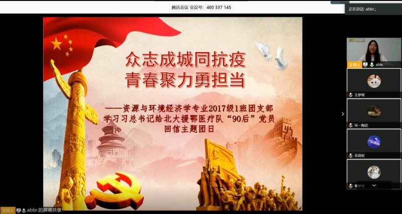 (通讯员:徐清� 常群)为深入学习贯彻习近平总书记给北京大学援鄂医疗队�90后”党员回�精神,广泛发动团员青年向在疫情防控一线担当奉献的青年学习,按照校团委有关要求,结合学院实际,3�18��23日,经济学院各团支部依托网络平台开展学习习总书记给北京大学援鄂医疗队�90后”党员回信线上主题团日活动�
