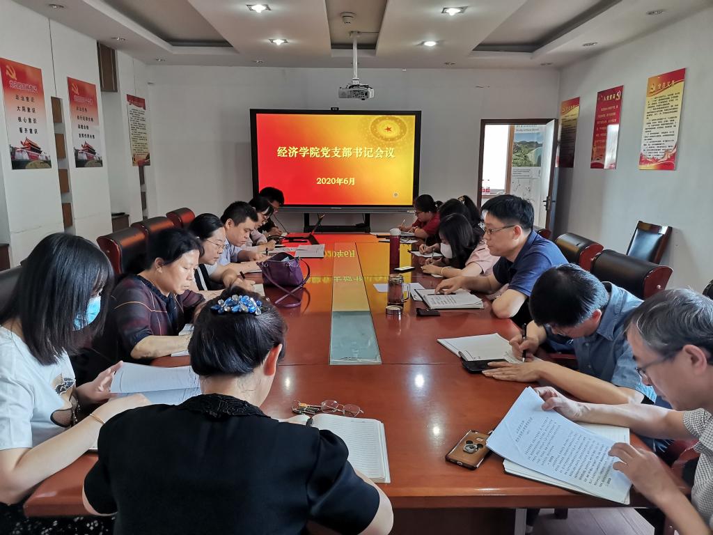 (讯� 李冰封)2020�6�4日上午,经济学院于舜耕校�1208会议室召开党支部书记会议。会议由经济学院党委书记姜主持,党委副书记董长瑞、高峰、仵颖涛,全体党支部书记参加了会议�