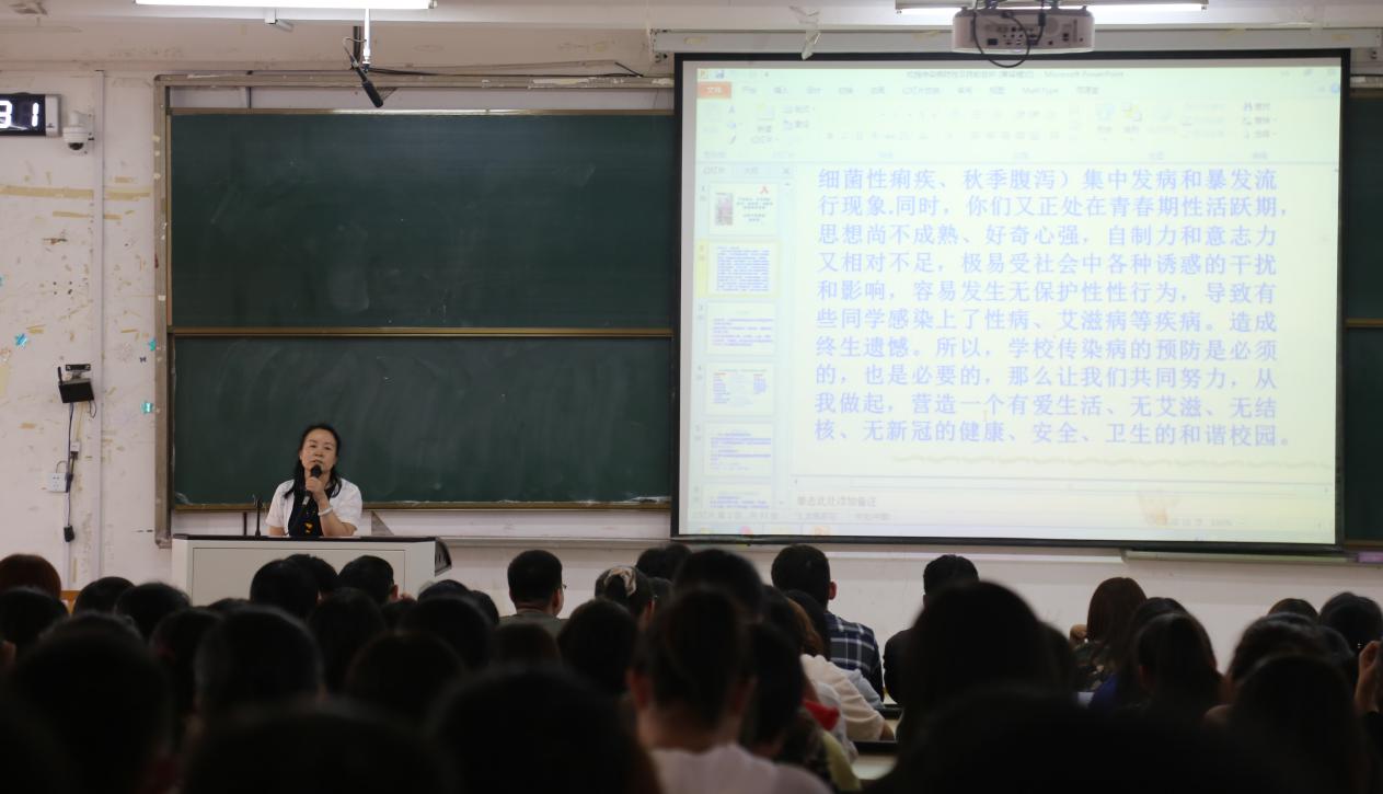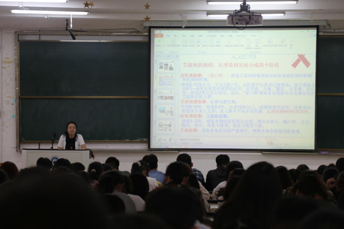 滕淑英向同学�介绍了目前常见传染病的种类、危害及预防手段,讲解了新冠肺炎的定义、传染源、潜伏期、临床症状、预防措施和应对策略等,如常通风,勤洗手,少聚集,在公共场合下佩戴口罩,远离可能的传染源,保持良好的生活习惯,提高自身免疫力,若出现发热症状及时主动就医等,重点讲解了正确佩戴口罩的方法,日常清洁及预防性消毒方法。讲座现场,滕院长向同学们展示了“七步洗手法”,提倡同学们养成勤洗手的好习惯。随后,滕院长介绍了结核病的基础知识,包括定义、潜伏期、传染源,我国肺结核的感染状况、临床表现和治疗措施等;最后,滕院长讲述了艾滋病的危害、定义、传播途径、病程、基本症状、预防措施、治疗方法,重点讲解了国家提出的“四免一关怀”等相关政策�