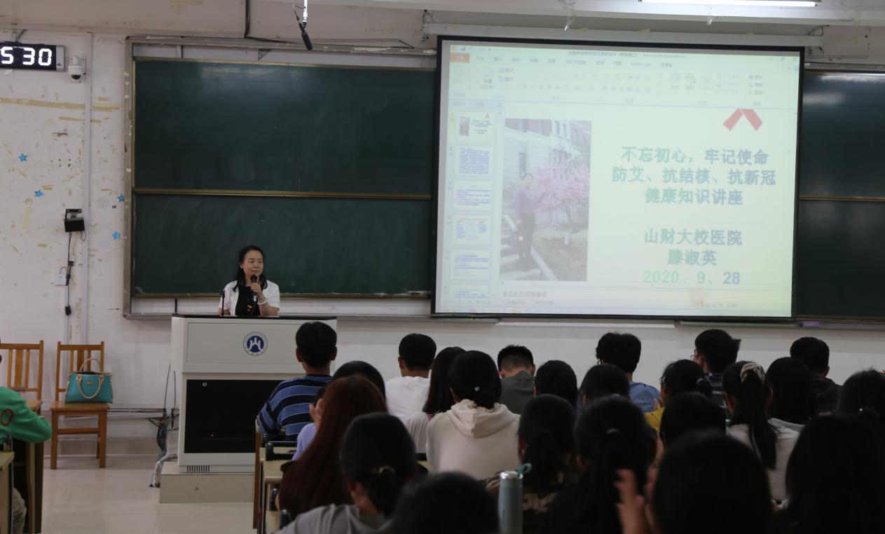 (通讯:冯源 许佳璇)为有效落实疫情防控工作,帮助新生树立健康意识,养成良好生活习惯,尽快适应大学生活�9�28�15:30,经济学院于圣井校区敏行楼举�2020级新生传染病防控与健康知识讲座。讲座特邀山东财经大学校医院副院长滕淑英主讲,院团委书记、新生辅导员付雯出席会议,经济学�2020级全体新生参加�