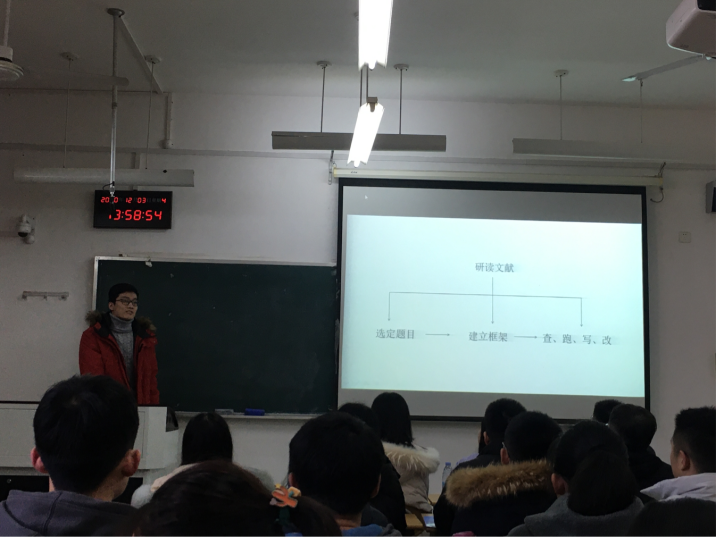 在“科研经历分享”环节,2018级西方经济学硕士研究生王山首�分享自身科研经验。王山认为选题和建立框架是科研工作的重中之重,他认为在科研过程中方法固然重要,但好的心态更为重要,叮嘱同学们“但行好事,莫问前程”�