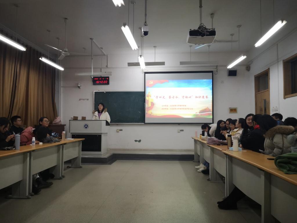 (通讯�:李冰封林安冉)为迎接中国共产党成�100周年,深入学�贯彻习总书记关于加强“四史”学习的重要讲话精神,加强研究生爱国主义教育,形成具有我院特色的“三全育人”德育模式,2020�12�13日晚,我院研究生会在舜耕校区教学楼3302教室开展了以“学四史,鉴古今,守初心”为主题的“史实我知道”知识竞专项活动�2020级全体党员及硕士研究生参加此次活动,活动由朱亚欣主持�