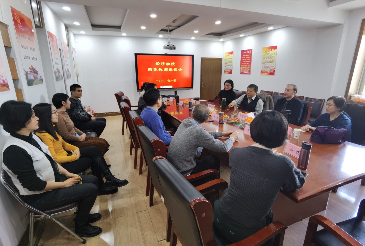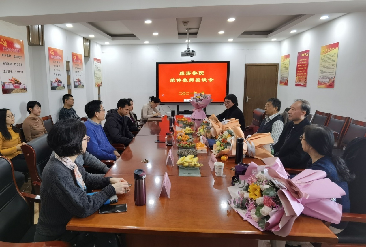 1�14日上午,经济学院在舜耕校区办公楼1208会议室举�2020年教师光退休座谈会。荣休教师张志勇、秦宪文、张红霞、郝国彩,党委书记姜伟、院长谢申祥以及院领导班子成员、学院行政人员共同见证了这一简短而温馨的时刻�