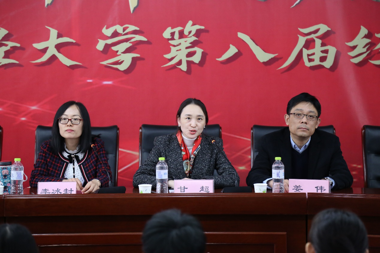 甘超强调经济学术文化节是根据财大共青团“一院一品”校园文化格局,构建精品校园文化体系的总体部署而精心打造的,是一项有底蕴、活力强、效果好,深受同�们喜爱的品牌活动,希望同学们在关注社会经济现象、探究经济学科前沿热点问题同时,重温党的光辉历程,感悟党的伟大成就,坚定听党话、跟党走的政治信念,激励自己,以奋发向上的精神状态,追逐梦想,奋斗前行�