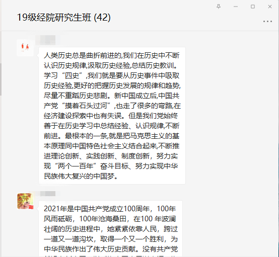 担复兴大任,做时代新人。党史思政课激励学生们将人生价值的实现与国家复兴结合起来。研究生们课后进行了热烈讨论,同学们纷纷表示,通过收看思政课,重温了百年党史,回忆了半年发展,深入了解了党的光荣传统、宝贵经验和伟大成就,对于总结历史经验,认识历史规律,传承红色基因,入学习领会习近平新时代中国特色社会主义思想具有重要意义�