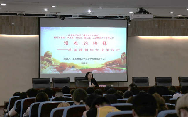 (通讯员:付雯 韩云昕)为深化学院党史学习教育,弘扬伟大的抗美援朝精神,5�14日下午,经济学院于圣井校区敏行楼举办学校成长成才大讲堂暨“学党史、强信念、跟党走”主题教育党史报告会。报告会由经济学院党委副书记李冰封主讲,院学工办主任裴斐、团委书记付雯、党委专职组织员王琦出席报告,经济学�2018级�2019级�2020级部分党员、入党积极分子和团�青年参加,报告会由裴斐主持�
