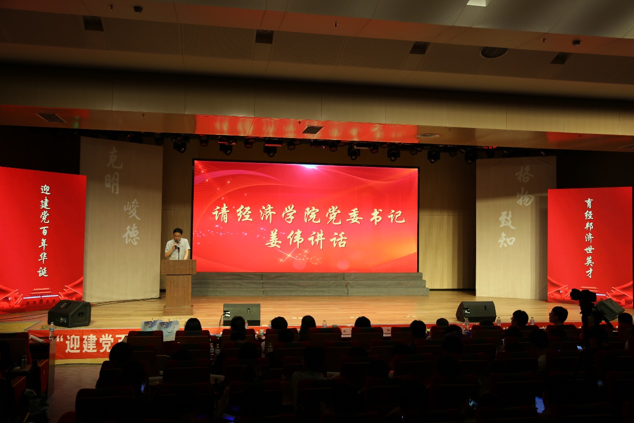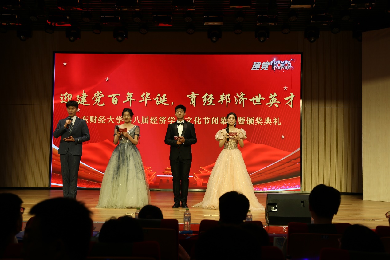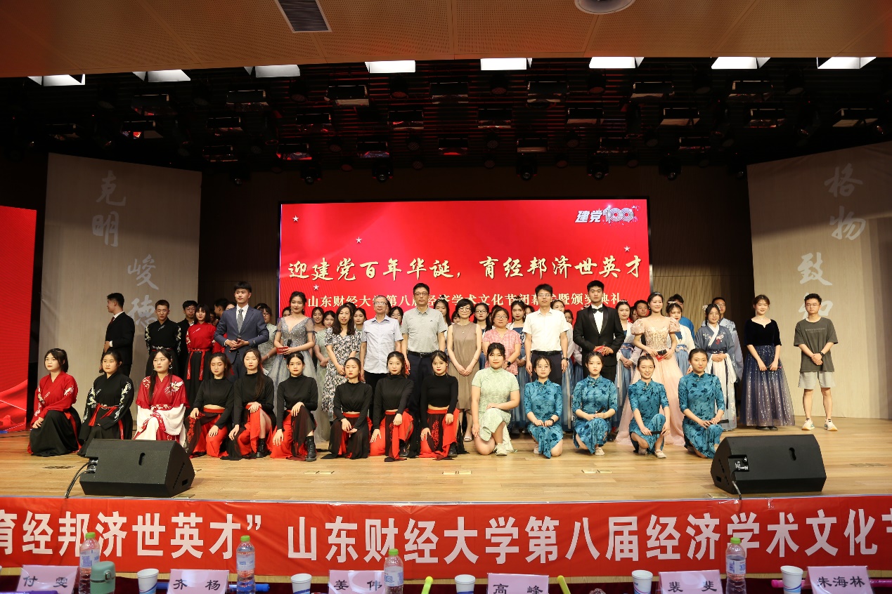 (通员:王涵 王嘉� 韩云� 冯源�6�9日晚,由校学生工作处、校团委、经济学院主办,经济学院团委、学生会承办的“迎建党百年华诞,育经邦济世英才”山东财经大学第八届经济学术文化节闭幕式暨颁奖典礼于圣井校区文化活动中心举行。经济学院党委书记姜伟、副书记高峰、副院长齐杨、学工办主任裴斐、团委书记付雯、就业办主任朱海林出席会议。获奖学生代表、经济学�2019�2020级学生到场参加�