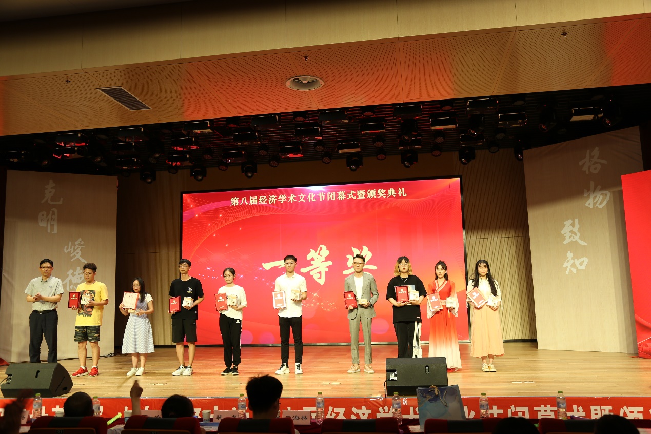 闭幕式开始,主持人带着观众以视频播放的形式,回�本届经济学术文化节各项活动精彩片段,随后高峰宣读获奖名单,各位领导老师为获奖同学颁奖,获奖学生代表2019级经济学3班郭硕同学发言�