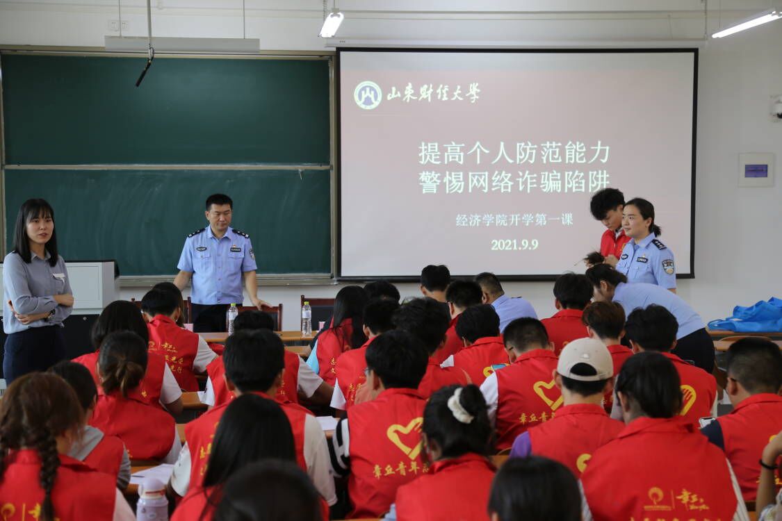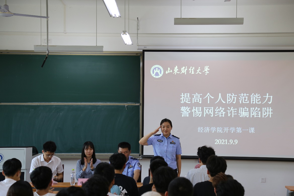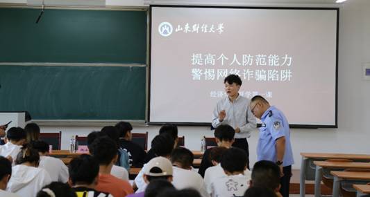 (通讯员:韩云昕)为预防新型电信诈骗,防止大学生被诈骗事件发生,打造安全、舒适、快乐的�习环境,9�9日下午,经济学院邀请章丘区圣井街道办事处派出所所长解学峰,副所长孟祥芳,街道办事处团委副书记魏山淼来校开展“提高个人防范能力,警惕网络诈骗陷阱”防诈骗宣讲活动,经济学院学工办主任裴斐,就业办主任朱海林出席会议,圣井校区19�20级部分同学参加会议�