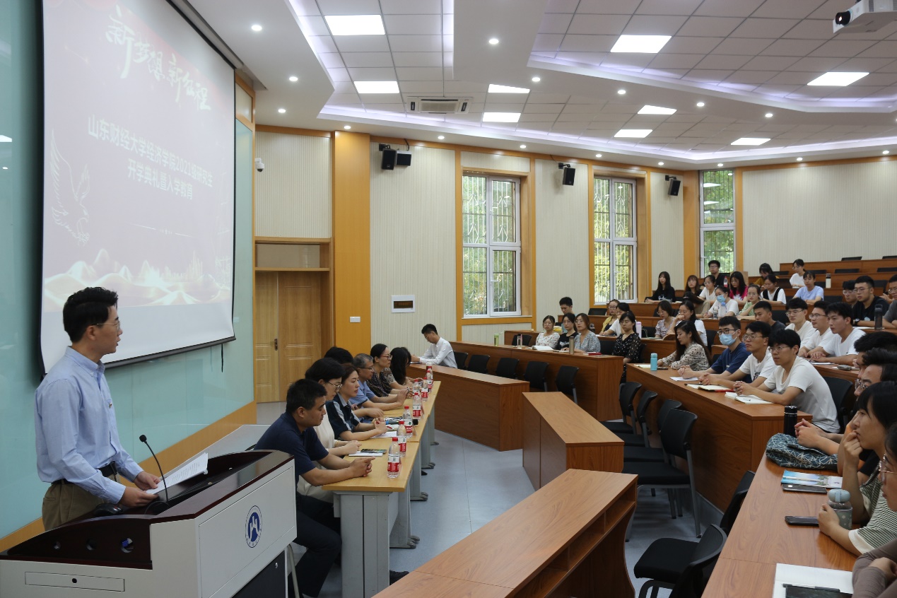9�13日下�16:00,经济学�2021级研究生新生开学典礼暨入�教育大会于舜耕校区第三阶梯教室举行。学院党委书记姜伟,党委副书记高峰、李冰封,副院长彭�英、齐杨,团委书记付雯,党委专职组织员王琦,研究生秘书刘应涛出席会议,2021级全体研究生新生到场参加。会议由付雯主持�