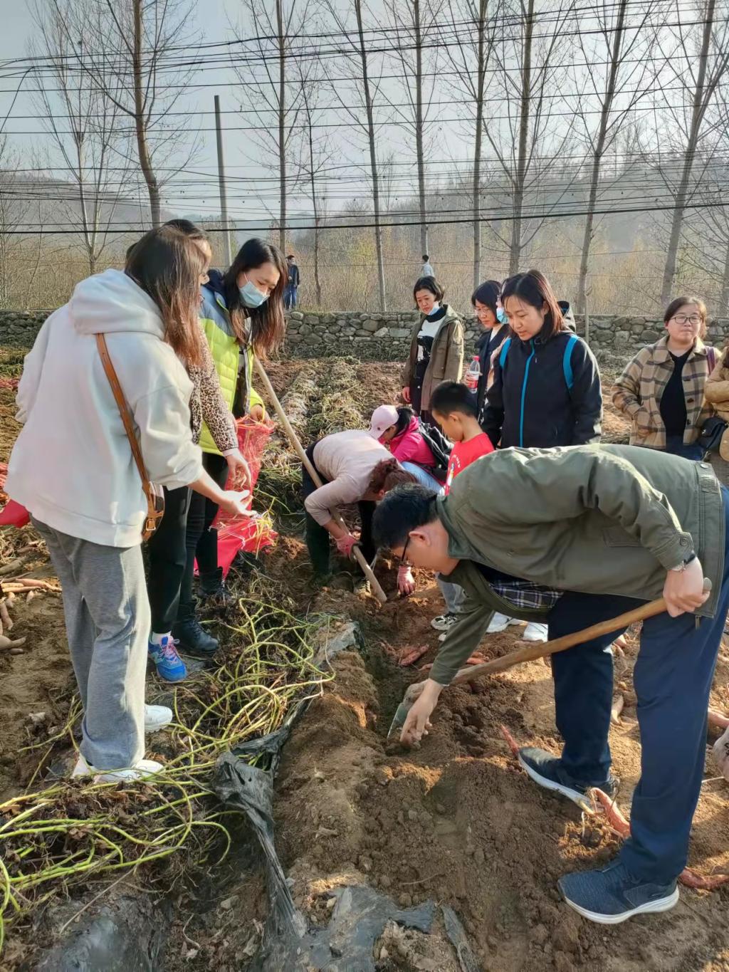 教职工们来到农田,就看到大片的蜜薯地,乡村空气香甜清冽,沁人心脾。勤劳的村民正在秋收劳作,一派繁忙景色。蜜薯的叶子经霜枯萎,覆盖在土垄上,蜜薯就藏在叶子下面的沙土里,师们迫不及待地簇拥着来到地里,开始采挖活动,有“单打独斗”的,有互相合作的,带孩子的教工还抓住机会现场普植物生长知识,场面十分热闹欢乐,大家充分体验到了劳动的乐趣�