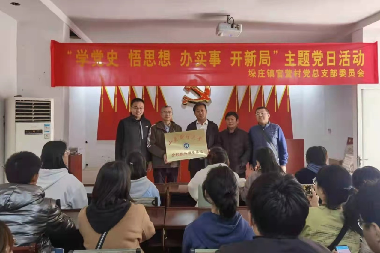 座谈会上,高峰就学院概况、专业建设、学生实践、校地合作等基本情况进行了介绍,赵荣厚向同学们详细介绍了官营村的历史沿革、村情村貌、资源环境基础、产业发展和村庄规划,并结合自身的经历给同学们指出职业规划方向,勉励大家积极投身乡村振兴伟业。最后,高峰�赵荣厚共同为官营村山东财经大学乡村振兴调研基地揭牌�