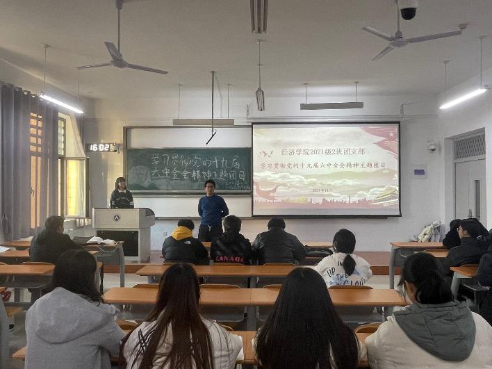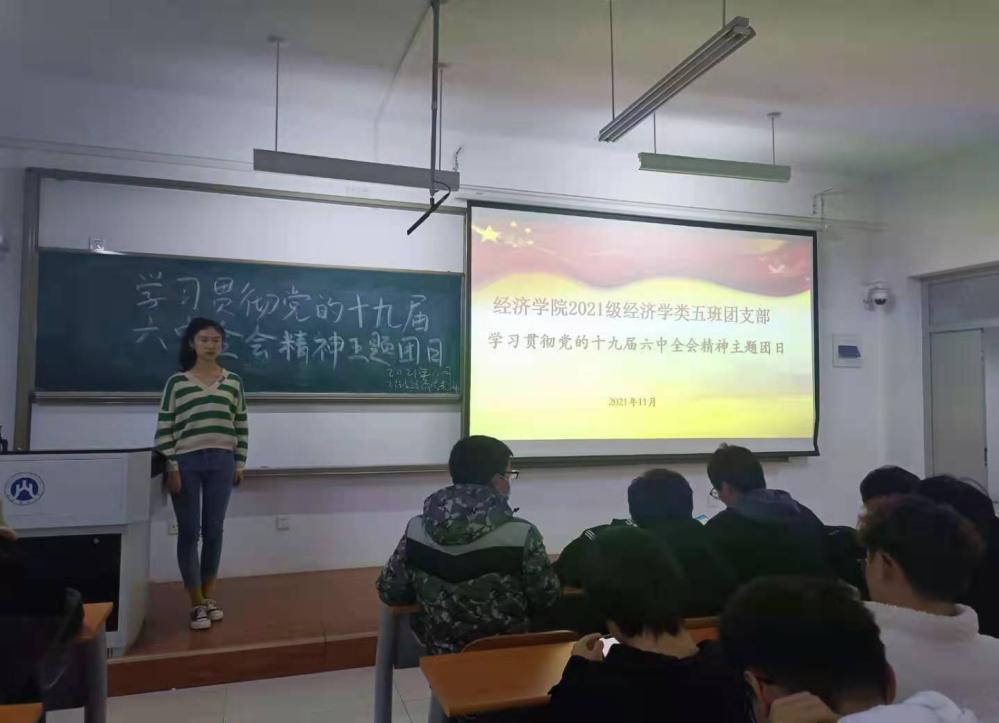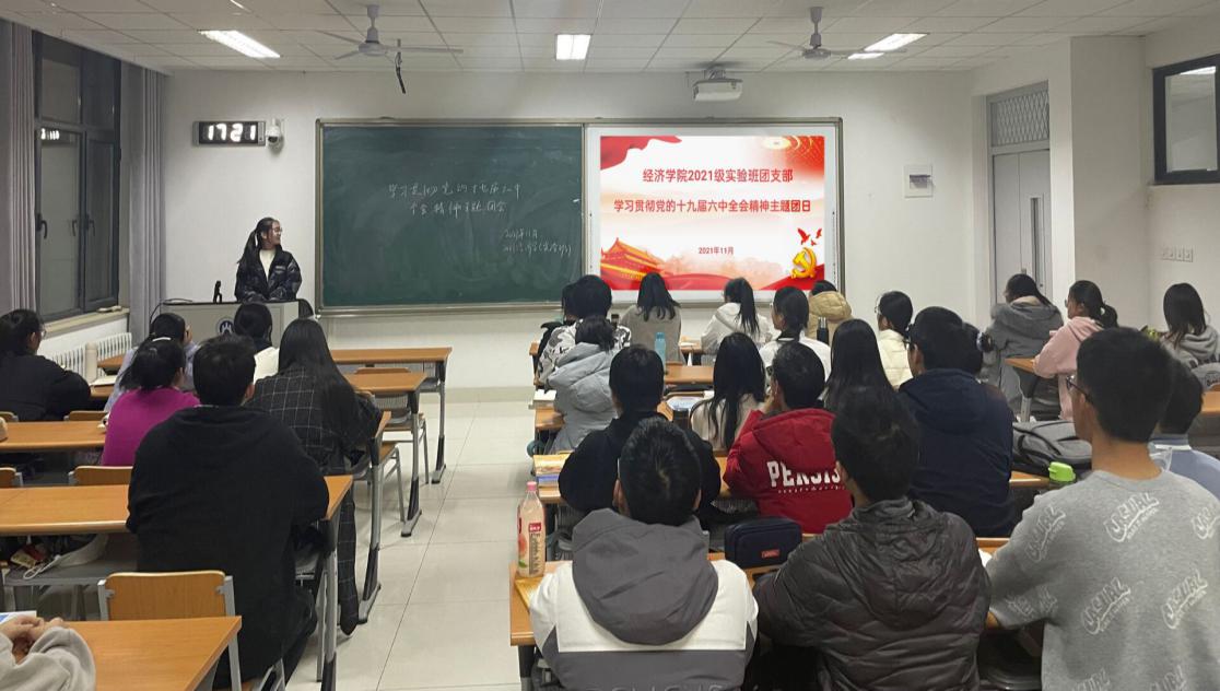 经济学院团委高度重视,广泛发动,积极宣传,对此次主题团日活动作周密部署和科学安排,制定详尽的活动方案。各个团支部围绕学习贯彻党的十九六中全会精神,开展了形式多样,内容丰富的主题团日。团支书带领团员青年观看党的第十九届六中全会相关视频资料,让同学们深刻领会、准确把握党的百年奋斗的初心使命,深刻认识中国共产党为什么能、马克思主义为什么行、中国特色社会主义为什么好的历史逻辑、理论逻辑、实践逻辑,以小组为单位在主持人的带领下学习《中国共产党第十九届中央委员会第六次全体会议公报》、《中共中央关于党的百年奋斗重大成就和历史经验的决议》的主要内容并进行提问,同学们展开交流互动,积极分享自己的学习心得与感受�