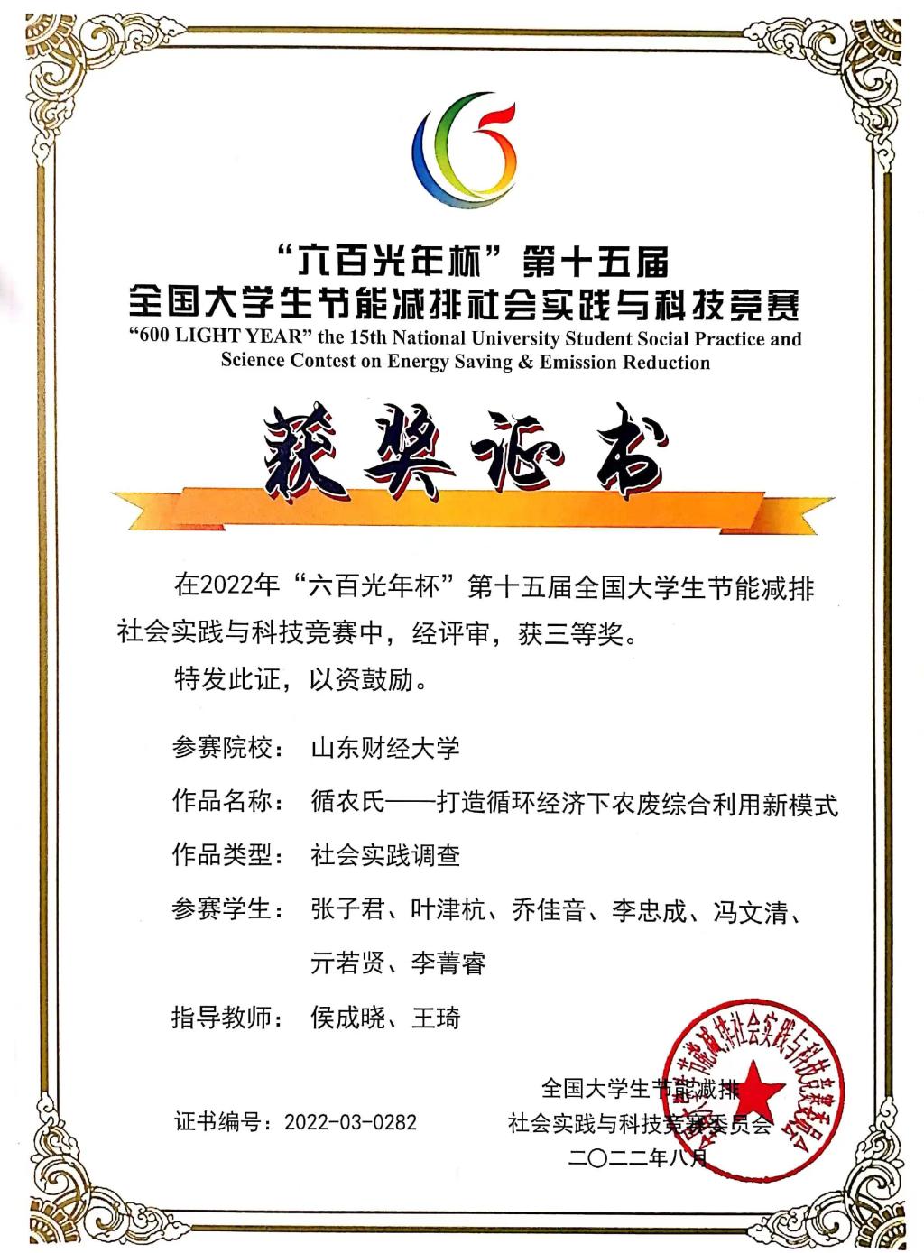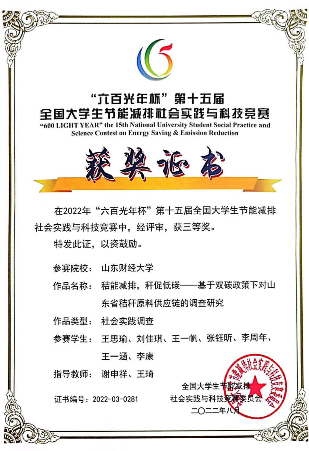 (通讯员:付雯 王思瑜�8�15日,由教育部高等教育司主办、天津大学承办的“六百光年杯”第十五届全国大学生节能减排社会实践与科技竞赛落下帷幕。由校党委委员副校长兼经济学院院长谢申祥和王琦老师指导�2020级经济学3班学生王瑜担任负责人的“秸能减排,秆促低碳——基于双碳政策下对山东省秸秆原料供应链的调查研究”项目,以及由金融学院侯成晓老师、我院王琦老师指导�2021级经济学实验班学生张子君担任负责人的“循农氏——打造循环经济下农废综合利用新模式”项目获得全国三等奖�