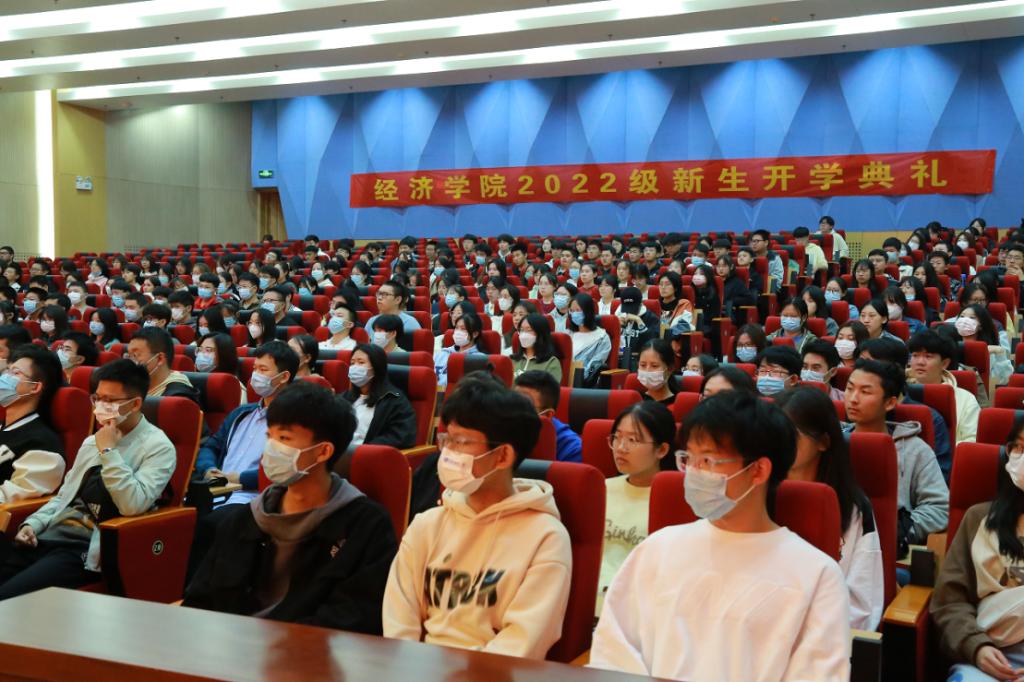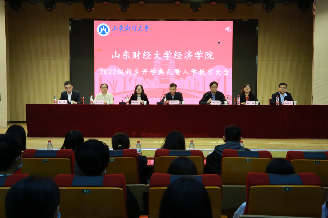 (讯员:付雯 张艺� 舒展�10�14日,经济学院2022级新生开学典礼暨入学教育大会于圣井校区文化动中心一楼报告厅举行。山东财经大学副校长、经济学院院长谢申祥,经济学院党委书记姜伟,党委副书记李冰封、陈静,副院长崔宝敏、张明志,教师代表云霄,学工办主任裴斐,院团委书记付雯,院党委专职组织员王琦,辅导员秦小晴、谭春光出席大会。大会由李冰封主持�