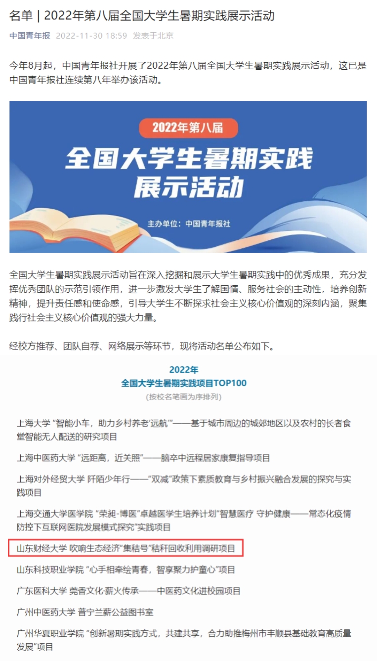 近日,中国青年报公布�2022年第八届全国大学生暑期实践展示活动全国百强,山东财经大学经�学院“吹响生态经济‘集秸号’——双碳战略下基于鲁、苏、冀、蒙秸秆回收各主体交易现状对秸秆原料供应链的调查研究”项目作为我校推荐的唯一项目类团队,经校方推荐、团队自荐、网络展示等环节,成功入选全国大学生暑期实践项目TOP100�