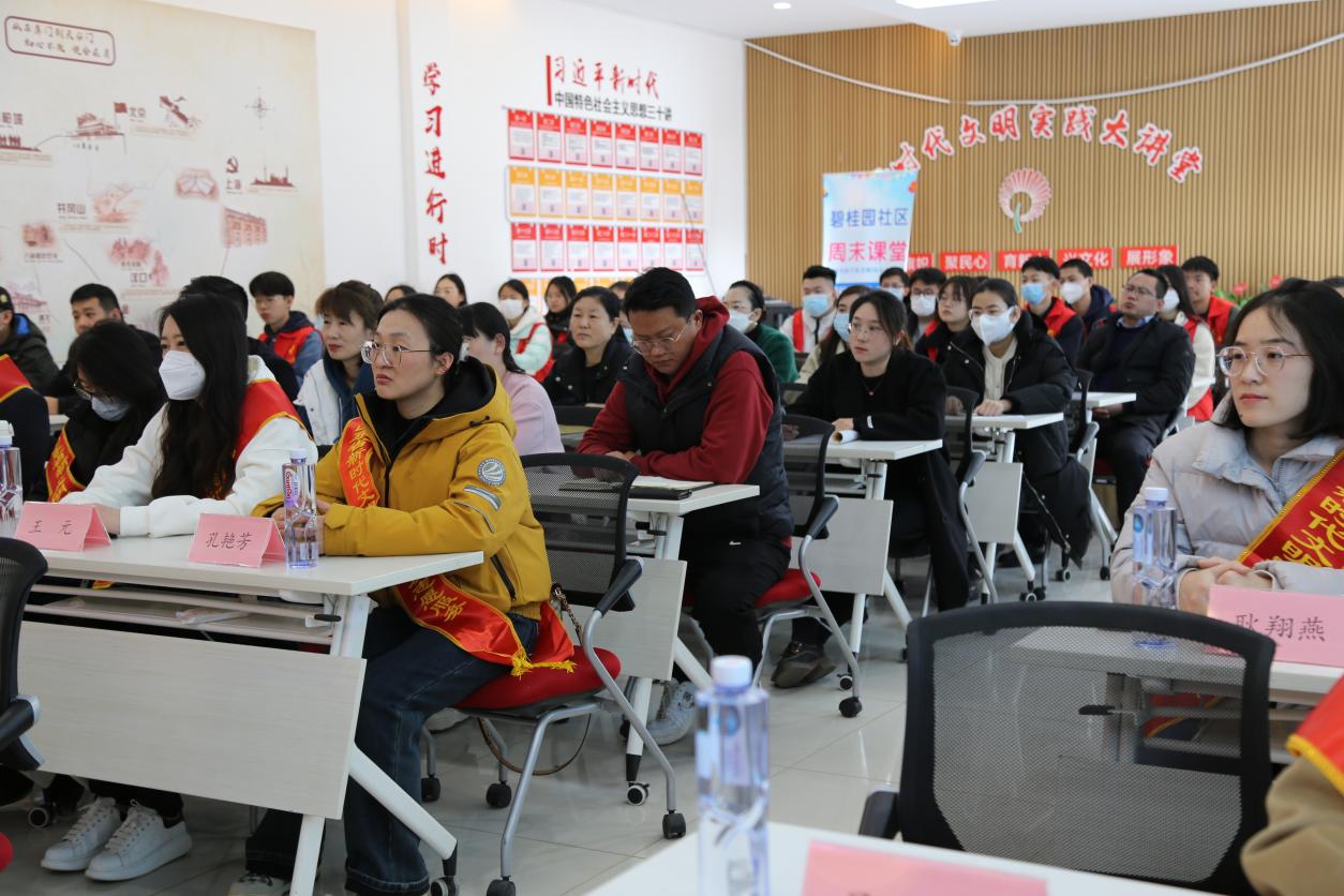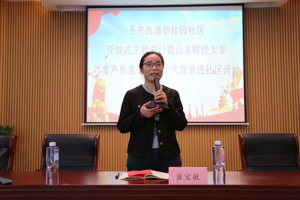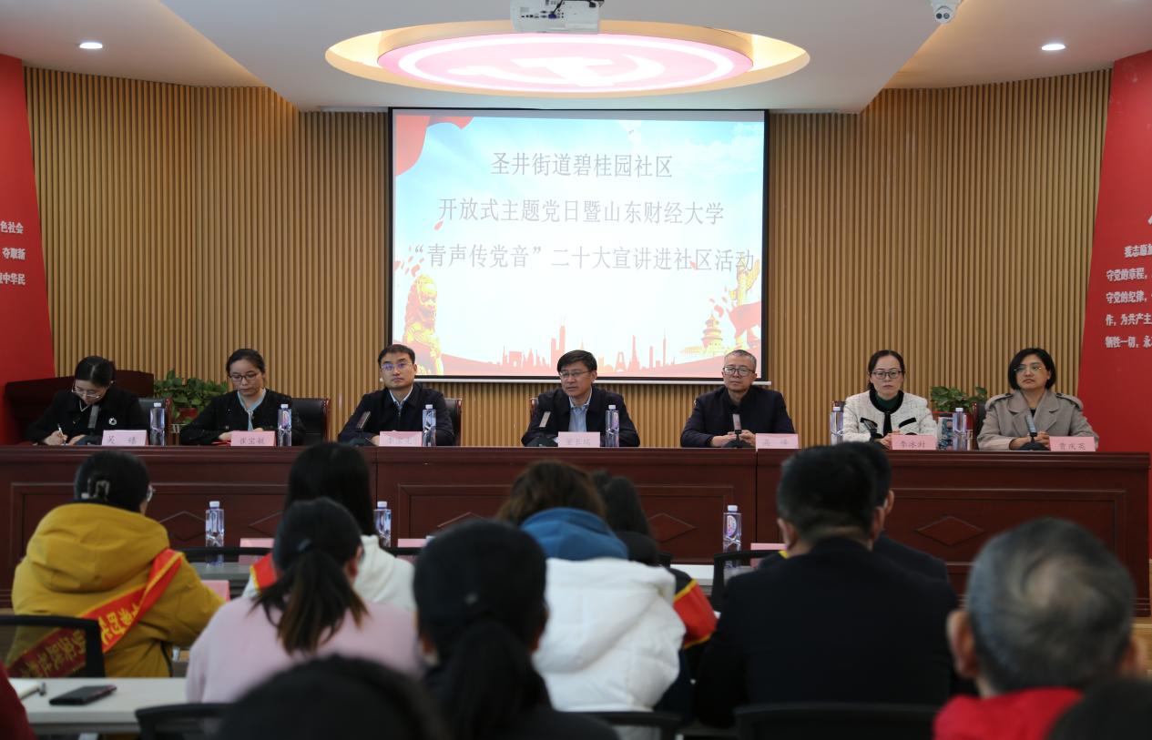 为深入学习宣传贯彻党的二十大精神,贯彻落实习近平总书记关于青年工�的重要思想,深入推进党的二十大精神在基层落地生根、见行见效,发挥广大团员青年参与社会治理的生力军和突击队作用�2�26日下午,山东财经大学经济学院“菁彩”青春网格员志愿服务队赴圣井街道碧桂园社区开展“青声传党音”二十大宣讲进社区志愿服务活动。山东财经大学乡村振兴研究院院长董长瑞,圣井校区管理办公室党委书记高峰,圣井街道党工委书记李宝光,经济学院党委副书记李冰封、副院长崔宝敏,圣井街道党工委委员、党建办副主任吴臻出席活动。经济学院师生代表和碧桂园社区全体直管党员参与活�。宣讲会议由吴臻主持�
