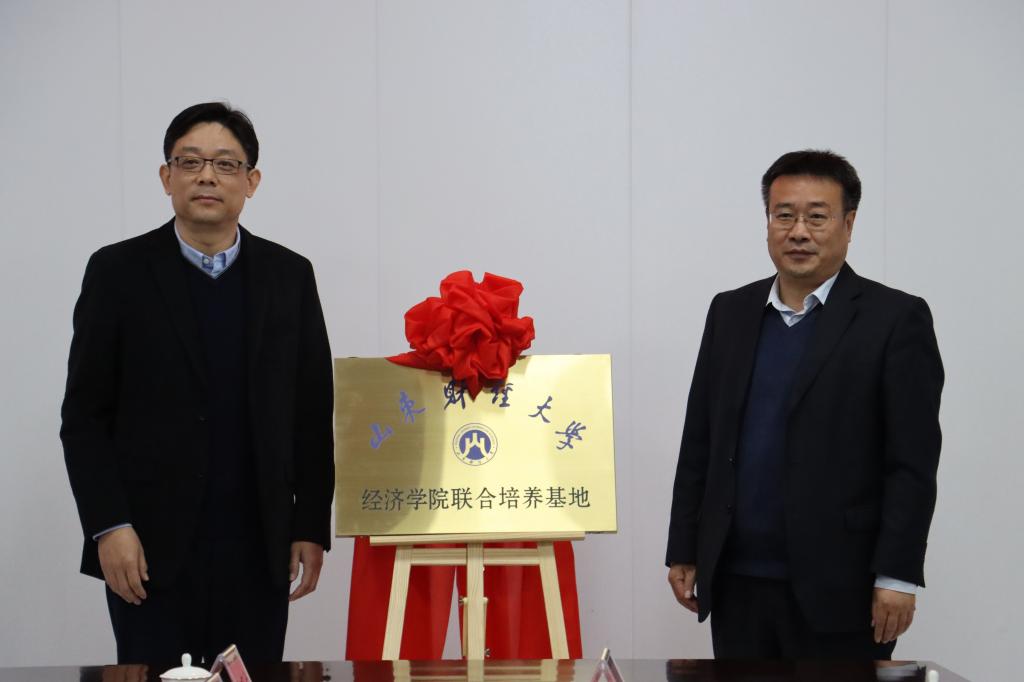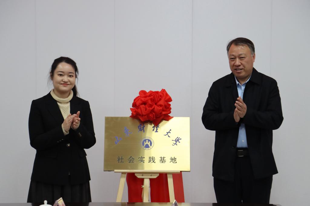 校团委社�管理部负责人谭雯雯、经济学院副院长崔宝敏分别与滨盛集团党委副书记王赞海签约共建社会实践基地协议和院地战略合作协议。谭雯雯与孙琳共同为社会实践基地揭牌。姜伟与谷春生为联合培养基地揭牌�