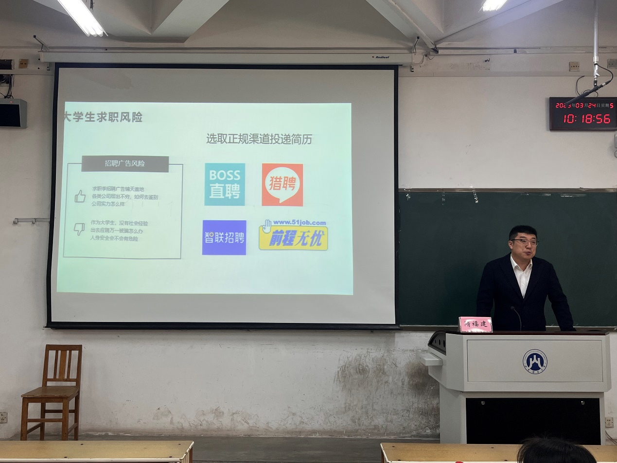 第一部分,加强风险认知。隋福建提醒同学们在求职过程中应当注意四个风险:一是大学生求职风险,应选取正规渠道投递简历;二是关注企业信用风险,通过企查查等了解企业信用状况;三是隐私泄露风险,可办理求职专用手机号等避免隐私泄露;四是合同用工风险,求职过程中应当诚实守信、有契约精神�