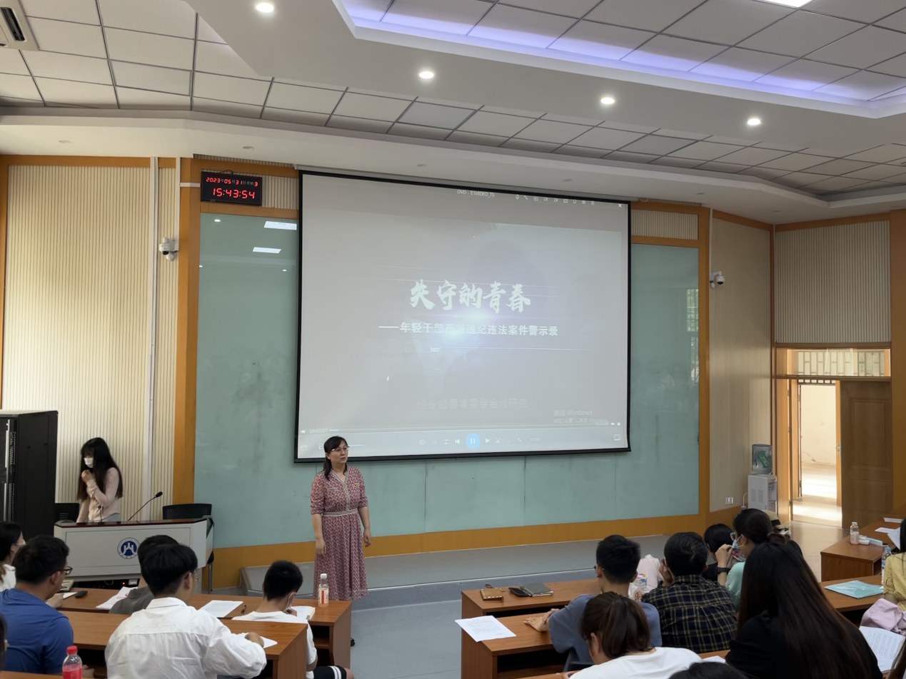 学院开展“青廉课堂”—�2023届毕业生党员廉政教育党课。学院党委书记姜伟以《锤炼党性,廉洁自律》为主题,深入阐释了全面从严治党的重大意义,并结合典型案例,深刻剖析了年轻干部违纪违法的特点和原因,警示同学要勤弹“思想尘”、多思“贪欲害”、常破“心中贼”、慎独慎微,知敬畏、存戒心、守底线,要树立正确的人生观、权力观和道德观,增强法律意识,坚定理想信念,牢记初心使命,扣好廉洁从业的“第一粒扣子”。他指出,“青廉课堂”是提高毕业生党员廉洁自律意识的重要举措,希望同学们坚定理想信念,坚定不移听党话,跟党走,筑牢廉洁从业思想道德防线,提高拒腐防变和自我保护能力�