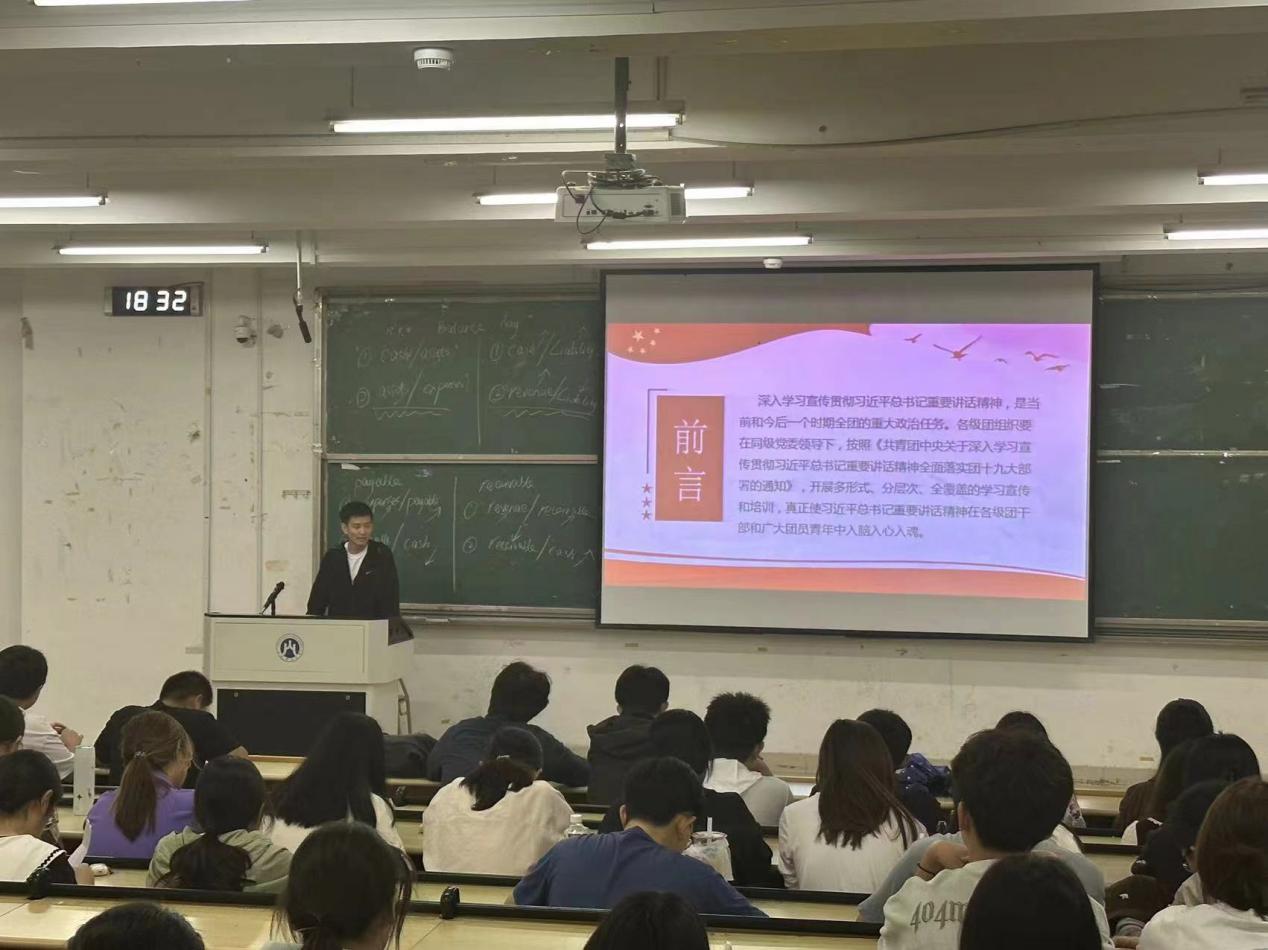 学院团委高度重视,立足组织性质和团员青年特点,坚持组织化学习、贯通式学习、实践中学习的基本做法,依据《共青团中央关于深入学习宣传贯彻习近平总书记重要讲话精神全面落实团十九大部署的通知》要求,广泛发动、周密部署、科学安排,以本次主题团日为依托,开展多形式、分层次、全覆盖的学习教育和培训。各个团支部由院团委辅导员老师主持,围绕习近平总书记重要讲话精神,查阅相关图文、视频资料,进一步了解习近平总书记重要讲话精神的内涵、重大意义,并总结出四大要义:一、牢牢把握新时代中国青年运动的主题。坚持问题导向,敢于刀刃向内;坚持目标导向,坚定不移走好新时代中国特色社会主义发展道路。二、引导广大青年坚定听党话、跟党走的政治信念。深化新时代青年马克思主义者培养工程,成为具有忠诚政治品格、浓厚家国情怀、扎实理论功底、突出能力素质、过硬斗争精神的青年政治骨干。三、组织动员广大青年在中国式现代化建设中挺膺担当。广大青年应在贯彻新发展理念、构建新发展格局、实现高质量发展中创先争优、担当作为。四、全面从严管团治团,锻造紧跟党走在时代前列的先进组织。坚持高标准严求,加强团干部和团员队伍组织建设。各团员青年分享自己的理解和感悟,提出自己的思考与见解,共同探讨如何将习近平总书记的�话精神融入到日常学习、生活和工作中�