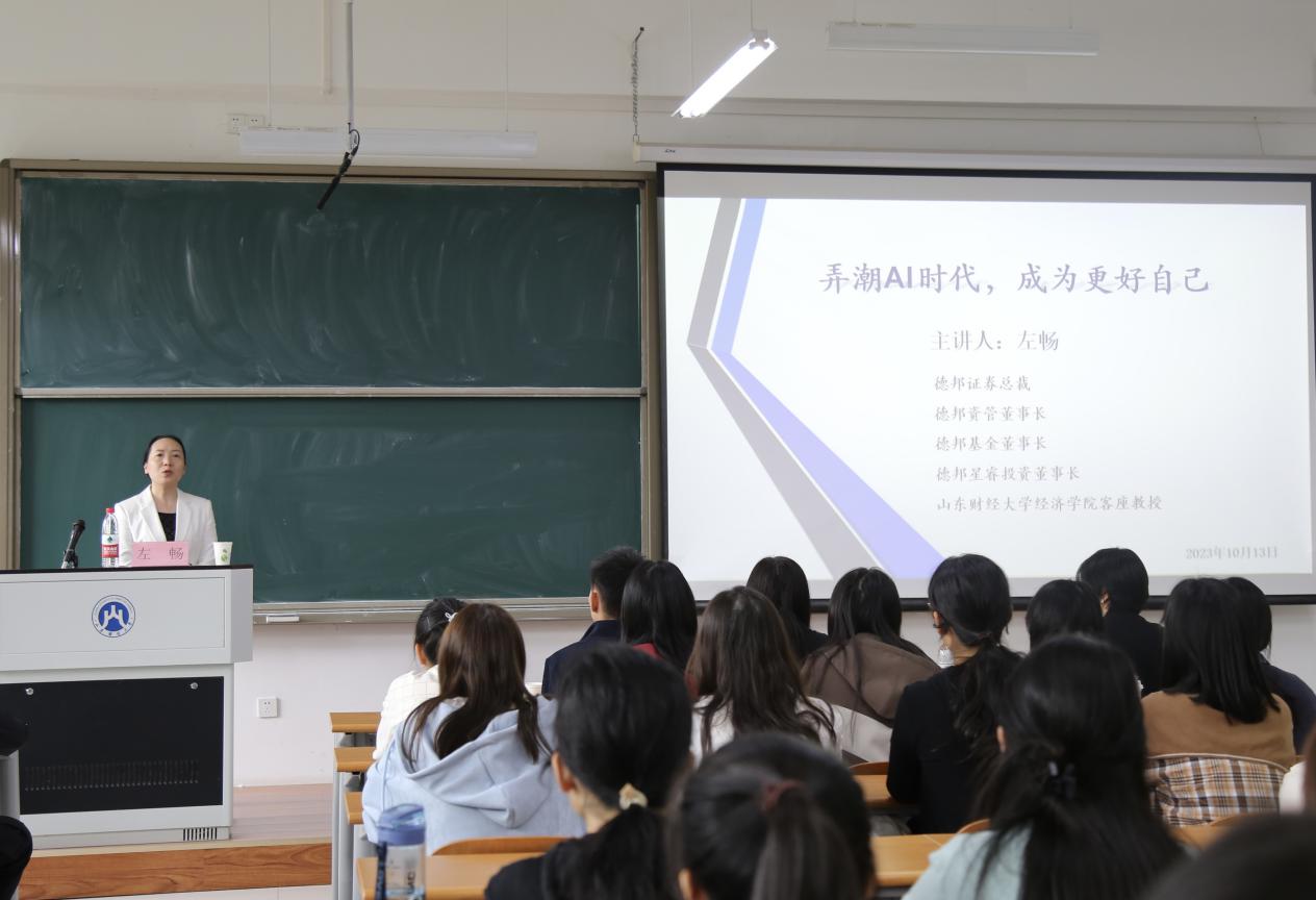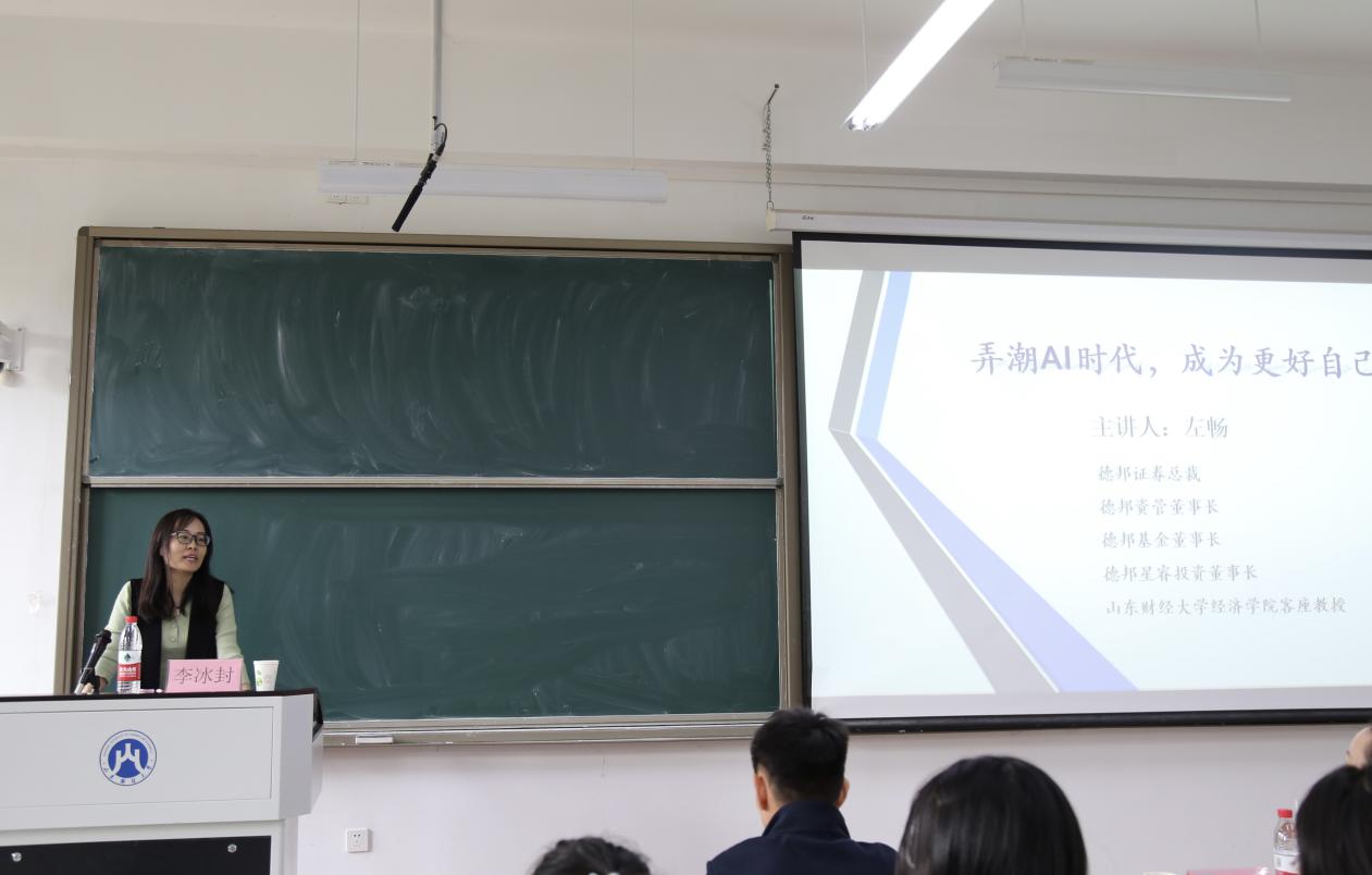 (通讯员:李冰� 赵普)为引导学生紧跟时代潮流,培养创新意识,助力科技自强�10�13日下午,经济学院邀请德邦证券总裁、经济学院客座教授左畅�圣井学子作“弄潮AI时代,成为更好自己”的主题演讲,德邦证券资管总经理徐盼盼,经济学院党委副书记李冰封、辅导员谭春光出席讲座。讲座由李冰封主持�