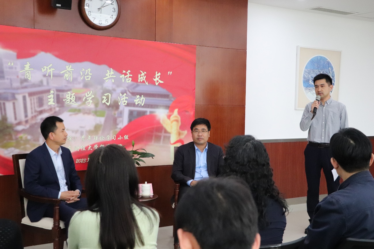 山东财经大学经济学院青年教师、数字经济学系副主任刘建旭,省委党校(山东行政学院)第十四青年理论学习小组成员、经济学教研部教师张友鹏,山东财经大�2021级产业经济学专业硕士研究生陈超,省委党校(山东行政学院)2022级政治经济学专业硕士研究生刘振,先后作为代表进行了交流发言。谢申祥、黄凯�现场与青年师生进行了互动交流�