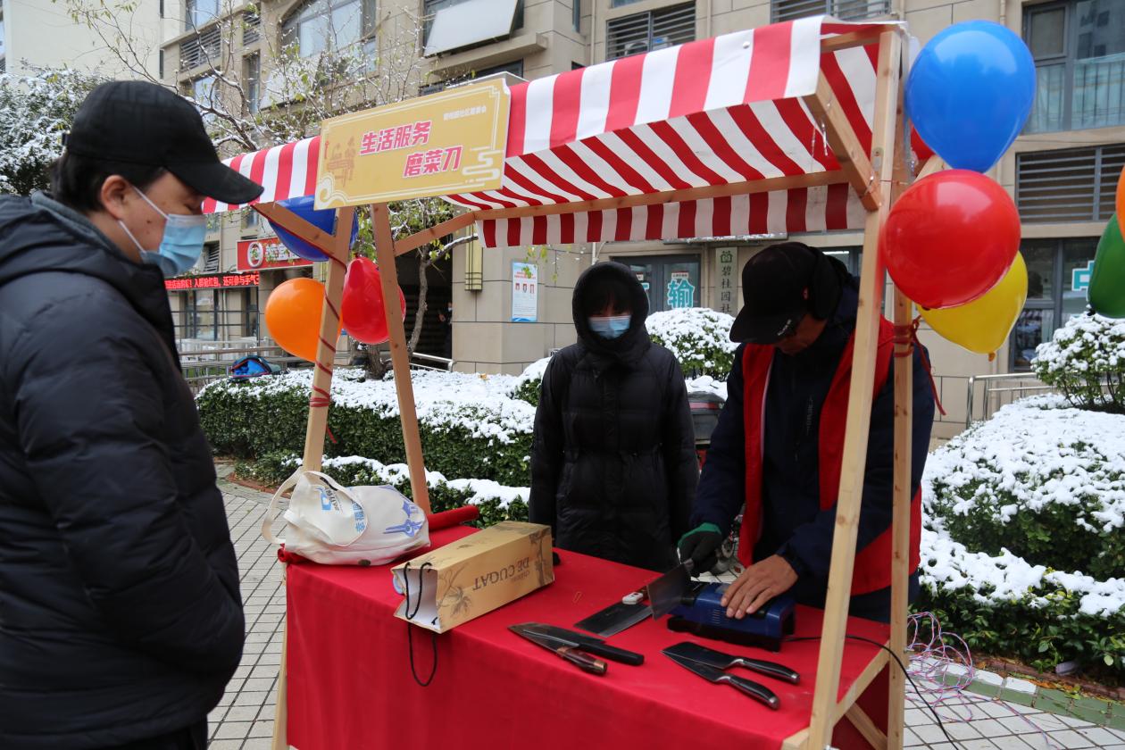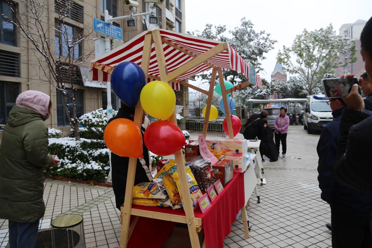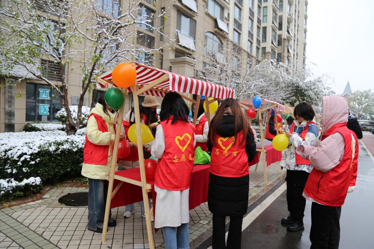 新雪初霁,寒风吹不散经济学院志愿者们火热的奉献之心,上午8�00,志愿者们统一前往碧桂�西区理想�3号楼,与社区工作人员一道,紧密筹办公益市集的相关摊位。从吹气球、摆摊位、拉横幅、摆桌椅,再到居民引导、设备维护、期间供给,志愿者们把好每一个环节,做好每一个细节,全力以赴确保本次公益活动成功圆满举办�