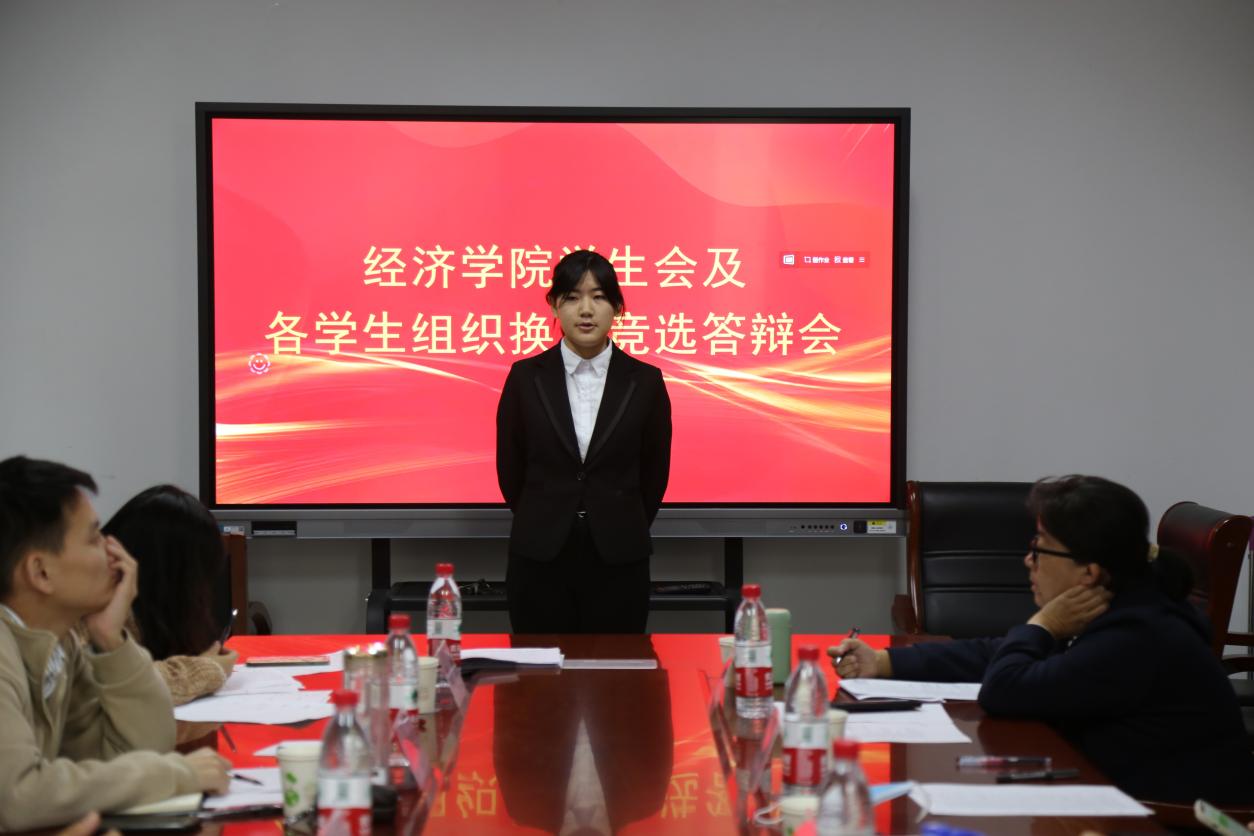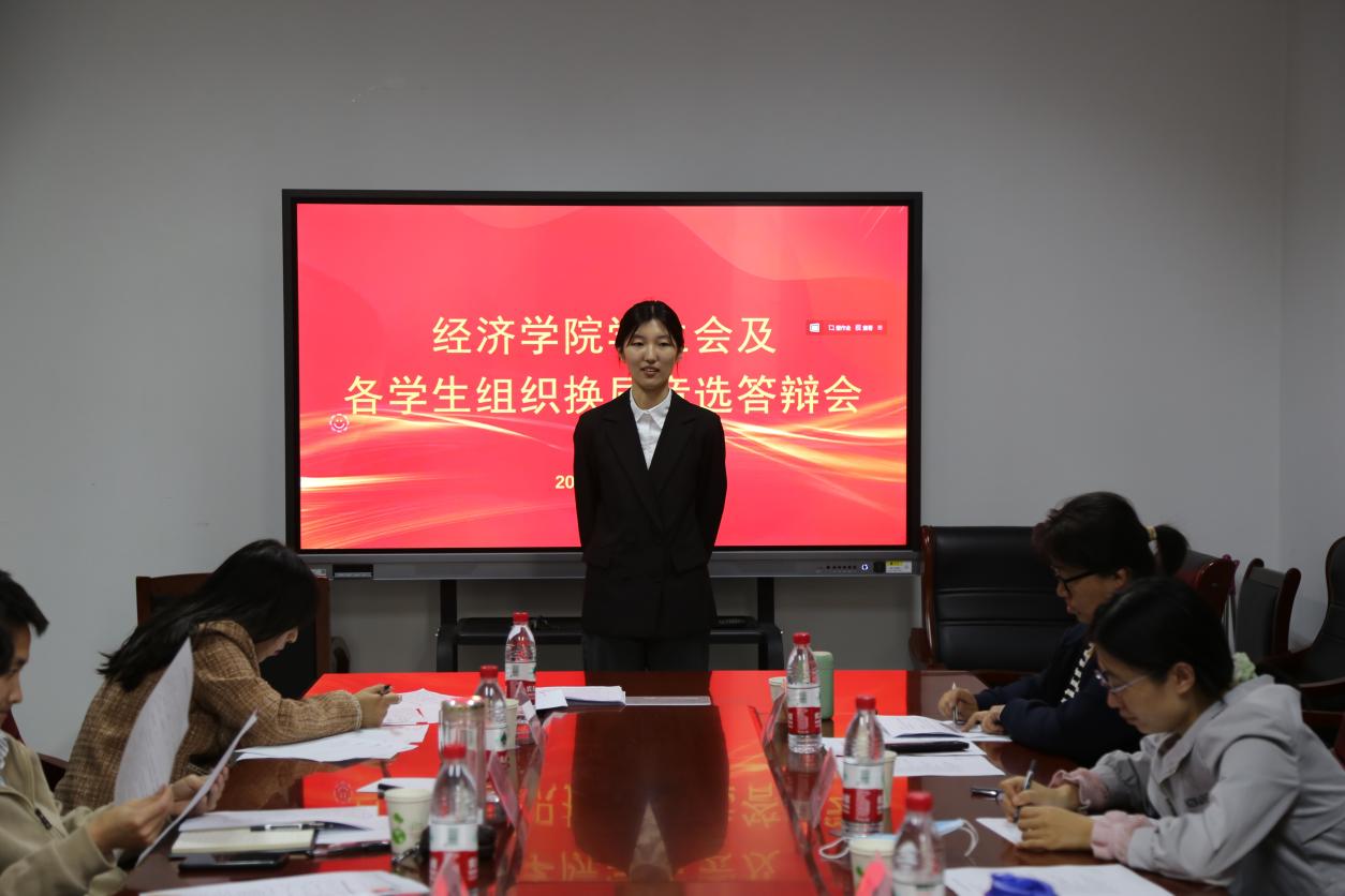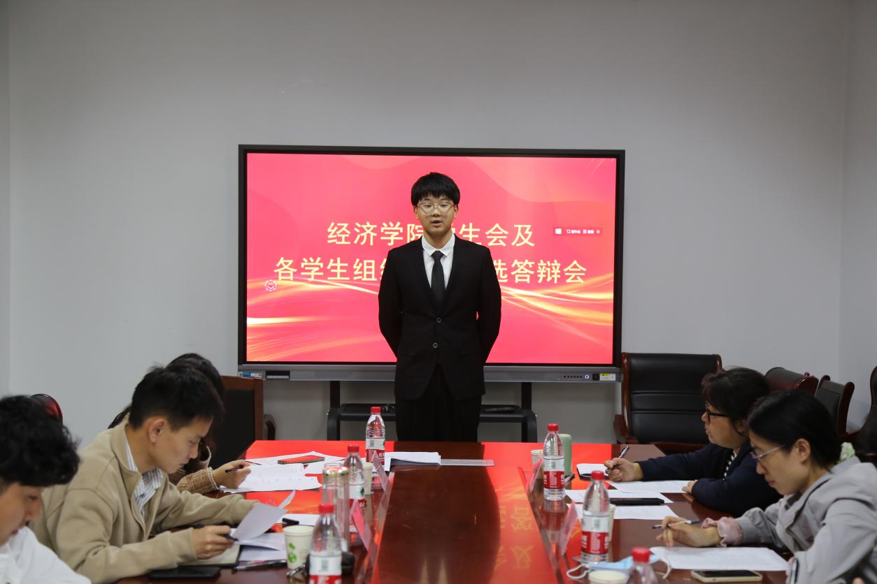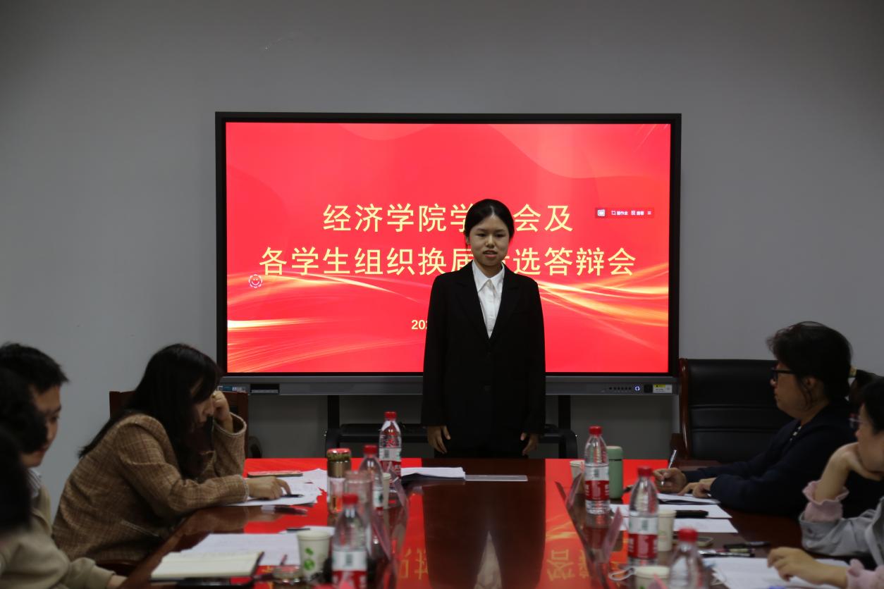 (通讯员:孙婷� 张艺� 公天� 李亦菲)为加强经济学院学生会及学生组织团队建设,引领青年学子成长成才,充分发挥学生的主人翁意识和骨干作用�10�19日下午,经济学院于圣井校区七号教学楼召开学生会及各学生组织换届竞选答辩会。经济学院学工办主任裴斐,院团委书记付雯,辅导员秦小晴、谭春光以及第十一届学生会主席团成员出席答辩会并担任评委,2021�2022级共120名候选人参加答辩�