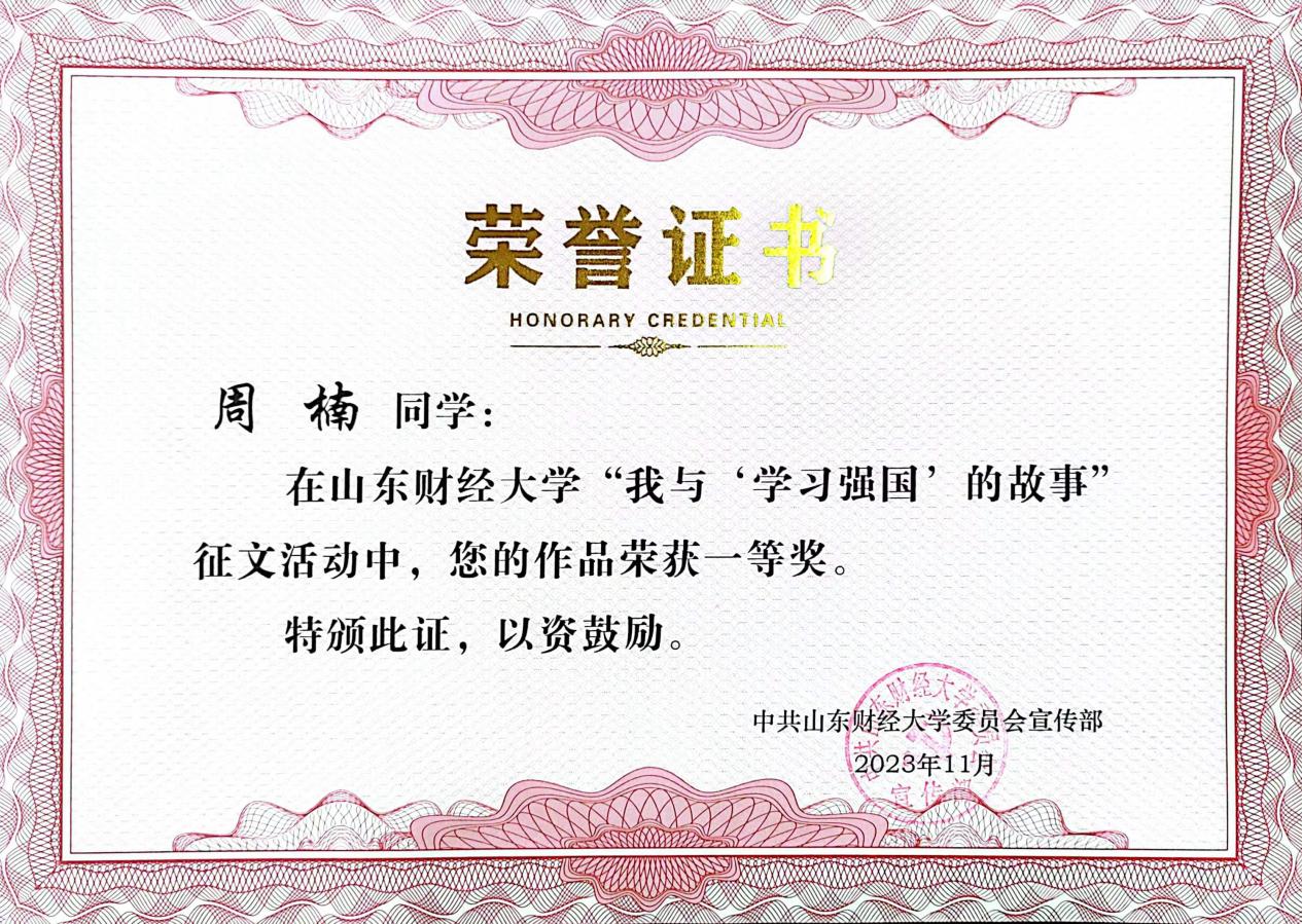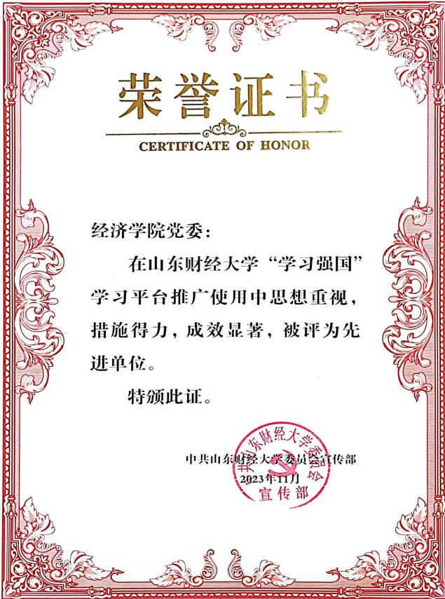 在本次表彰会上,经济学院党委再次荣获“学习强国”学习先进单位,宋鑫、张艺佳、苏芸琦、于凤芹、马祥振、冀兆鹏、滕�7名同志荣获“学习强国”学习先进个人。“我与‘学习强国’的故事”征文比赛中,王元获教师组一等奖,周楠获学生组一等奖;郝海波、焦伟华、邵瑛瑛获教师组二等奖,文莎莎、吴佳俊、张艺佳获学生组二等奖;李珂涵、裴斐获教师组三等奖,景浩然、田聪、汪榆佳、赵雅轩获学生组三等奖。“红心向党队”的作品《青春心向党建功新时代》获山东省第四届高校思政短视大赛校级选拔赛三等奖。经济学�2023级硕士研究生周楠作为征文比赛获奖者代表发言�