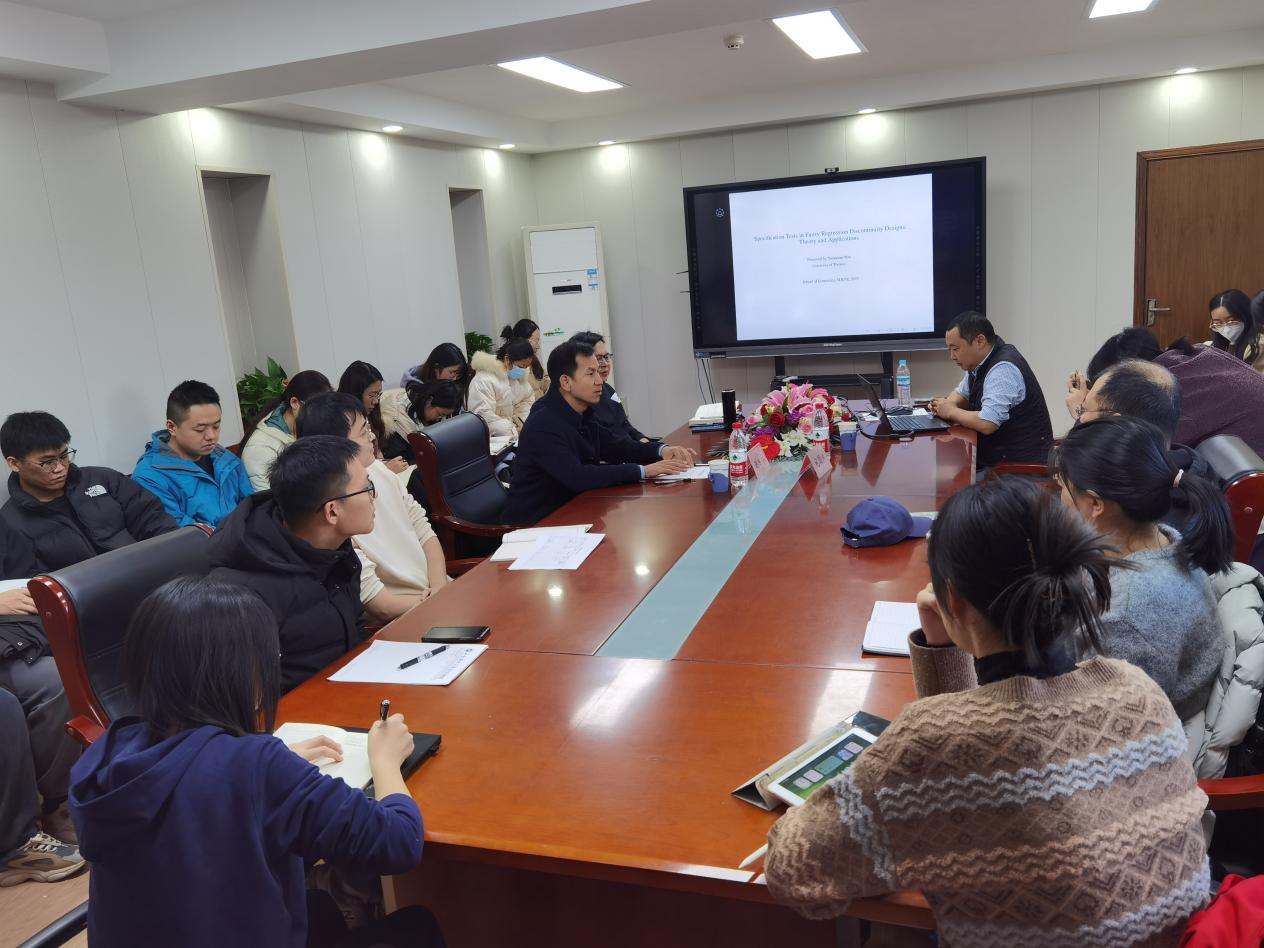 本次论坛的主题是“模糊断点回归中的模型检定:理论和应用”。宛圆渊的研究主要针对模糊断点回归模型中的经典假设,提出了改进断点回归模型有效性的检验方法,并对断点回归的实际应用与范操作进行了深入讲解。宛教授介绍说明了“模糊断点”研究的动机并指出断点回归模型的前提假设,即局部单调性假设和局部连续性假设;在详细介绍断点回归模型前提假设的基础上,提出一种新的断点回归模型假设检验方法,从理论计量的视角指出,STI方法的满足是断点回归有效性的必要条件;宛教授分别以中学班级规模断点研究设计、补贴发放标准的断点研究设计等实际研究作为案例,呼应了所提出理论检验方的�靠性�